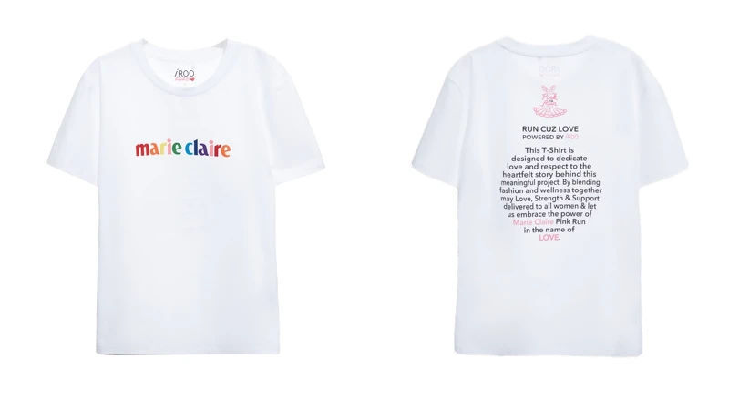 跑衣正面以彩虹色Marie Claire字樣象徵繽紛能量,Pink Run標誌中兩個特別挑選的粉紅色「i」,則凸顯女性「勇敢自我」的精神,也象徵活動邁向第 11 個年頭,以「1+1 倍伴的力量」為主題,傳遞陪伴的價值。背面字樣更進一步傳遞「為愛而跑」的公益初衷,讓這份粉紅力量不僅停留在賽道當天,而是持續融入每個人的日常。