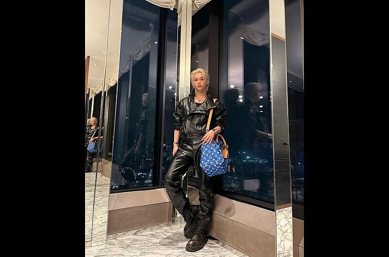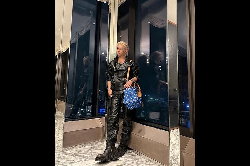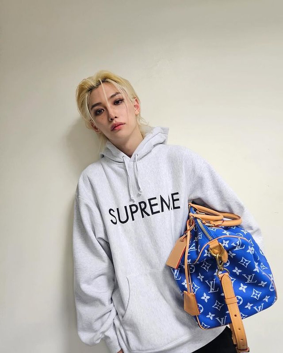 首先看到 Stray Kids Felix 以 Supreme 寬鬆連帽上衣搭配寶藍色 Speedy P9,與他帥氣的一頭金髮完美搭配!