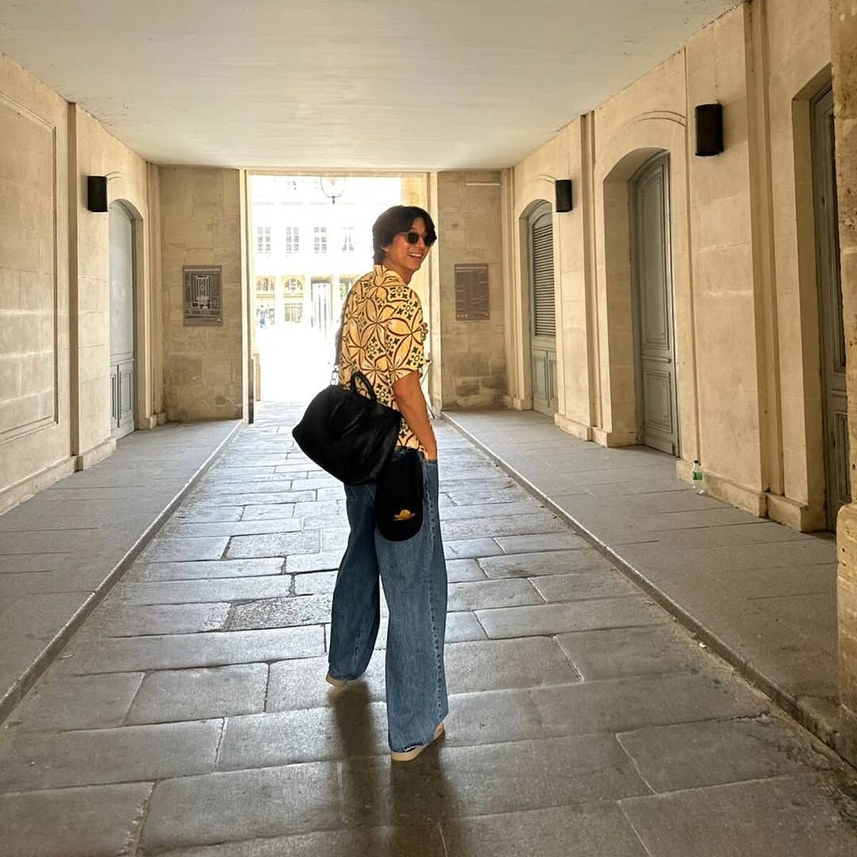 除了硬挺的軍裝風格,孔劉也穿上印花襯衫搭配丹寧褲,搭配全黑手袋,平衡了整體色調,這套私服造型也充滿濃厚的夏日度假氛圍!