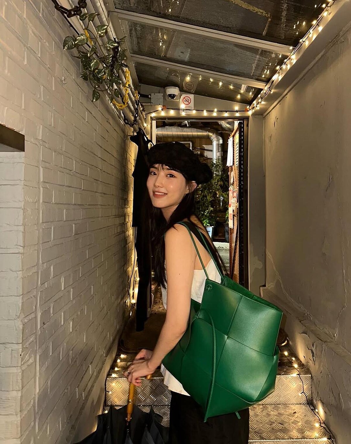 尹瑞娥挑選包包準則大多以極簡素面、具有特色的包型為主,像是這顆Bottega Veneta的編織包,她便不是選擇人氣的經典包型,而是形狀特殊的大菱格編織托特包,遠看彷彿一顆愛心!沉靜的森林綠色則為簡單的黑白穿搭提供時髦亮點。