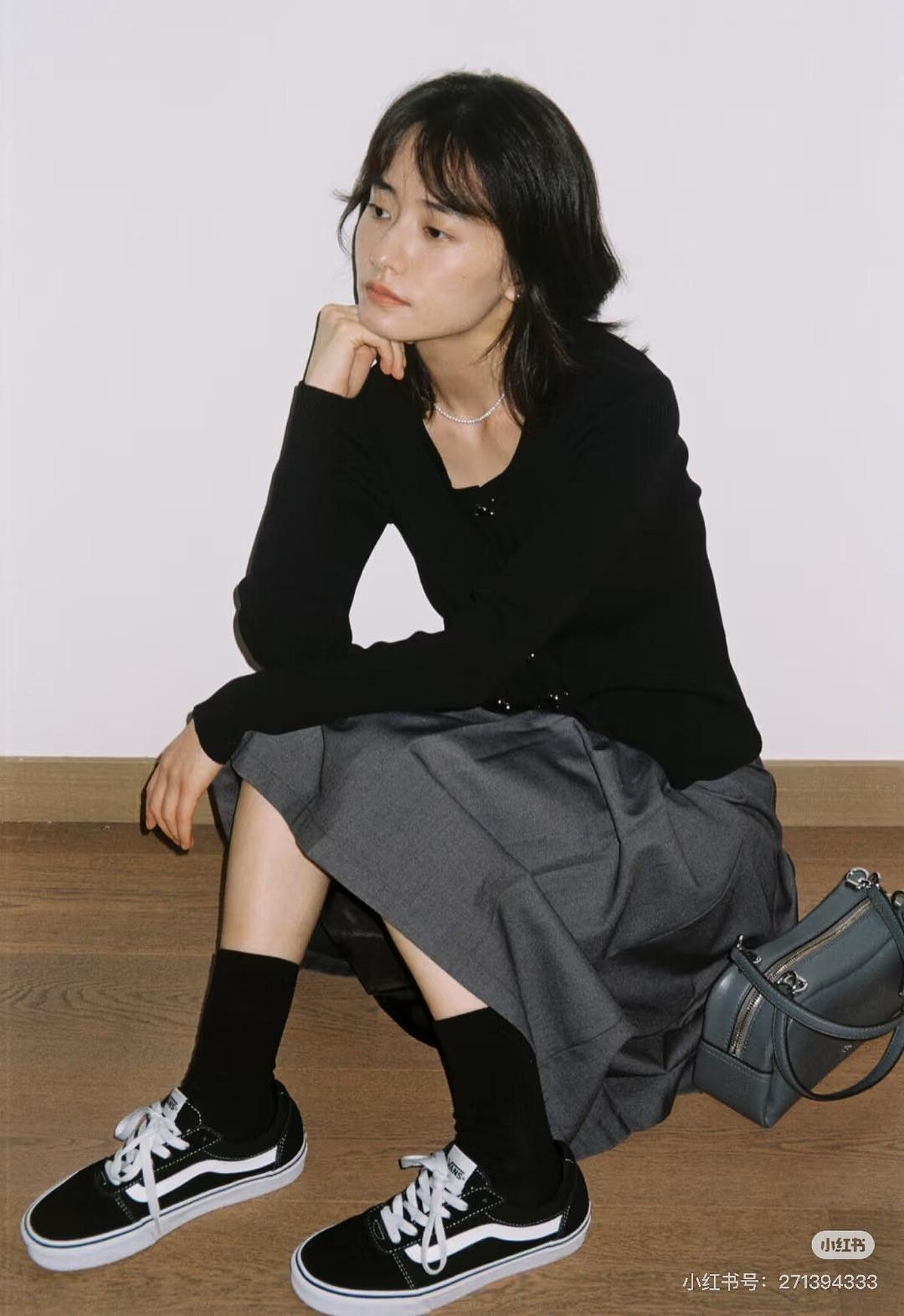 柴碧雲私下也奉行黑、白、灰這項最不失手的組合!黑色針織衫沉穩簡單,灰色西裝裙增添專業氣息,而滑板鞋的加入,則中和了整體的正式感,拉出一種輕鬆、街頭又不失質感的平衡。