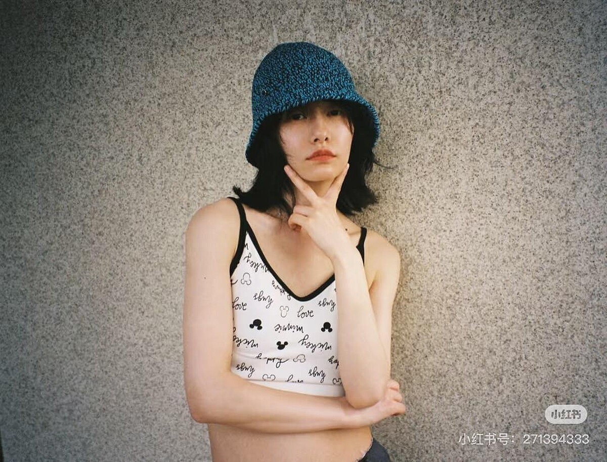 一件簡單黑邊白底的細肩背心,呈現豪不造作的少女心,並帶點街頭感;藍黑相間的圓頂帽,則添上文藝又不羈的奇趣氛圍,這並不是人人都能駕馭得來的單品,而柴碧雲總能巧妙掌握這份獨特韻味。