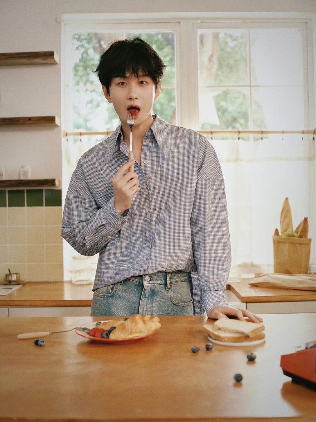 成毅平時的穿搭大多都是一些非常基礎百搭的單品,就連穿搭新手也能夠輕鬆學習,像是這身Tibi淺藍格紋的襯衫,搭配Maison Margiela的水洗高腰牛仔褲,打造出一種彷彿日系雜誌的稚氣氛圍。尤其是版型的選擇上非常聰明,襯衫大翻領設計打破傳統硬挺感,變得輕鬆休閒,材質也輕薄許多,帶來一絲慵懶與隨性,而微鬆的牛仔褲則營造出舒適自在的生活感,多了一種鄰家男孩氣息。