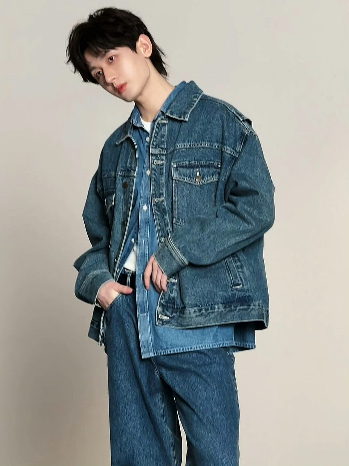 丹寧疊搭也是非常推薦的必學時髦法則,成毅這套全身GAP的丹寧穿搭則完美示範了如何在美式復古與現代之間找平衡。內層淺藍色牛仔襯衫與深色寬鬆外套營造層次對比,讓視覺不至於單一,反而更具節奏感。下身的寬版直筒牛仔褲呼應上身結構,使整體造型既率性又不失層次。