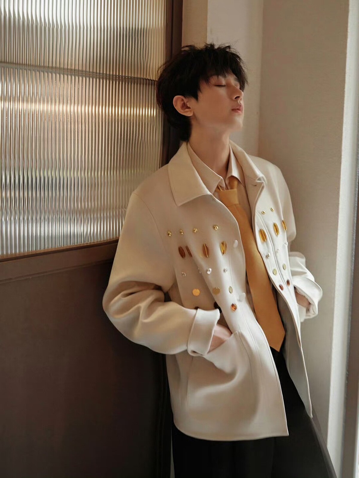 成毅在相對正式的場合中則會切換成「貴公子」模式營業,這套白色翻領外套上的圓點裝飾讓整體視覺更加豐富,兼具玩味與奢華感。內搭的襯衫與黃色領帶,色彩雖簡約卻層次分明,傳遞出沉穩之餘也不失青春朝氣。搭配深色西裝褲,整體輪廓修長,完美詮釋當代都會男子的精緻穿衣哲學。