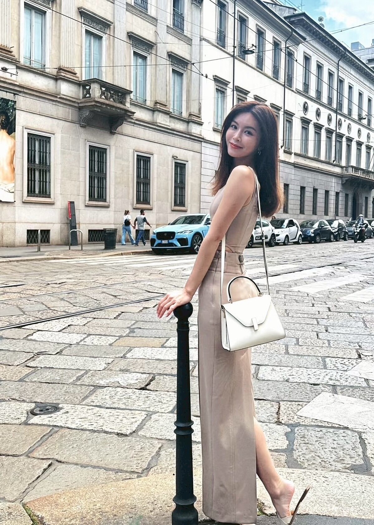 文詠珊的私服風格給人一種歲月靜好的感覺,包款的選擇方面也以低調經典為主軸,像是以 Quiet Luxury 「靜奢風」聞名的義大利皮件品牌Valextra就是文詠珊的愛牌之一,旗下標誌性的Iside包款,靈感源自埃及金字塔,以幾何梯形外型與簡約翻蓋著稱,是義大利工藝核心代表作,這款包沒有浮誇 Logo,而是運用招牌的黑色油墨描邊勾勒包身輪廓,搭配Millepunte 小牛皮革以及方形扭轉鎖釦打造強烈辨識度。文詠珊選擇穿著米色貼身洋裝出鏡,同樣色調的 Iside映襯之下,讓造型層次回歸乾淨俐落,低調中蘊藏高級氣息,正好呼應她一貫的知性風格。