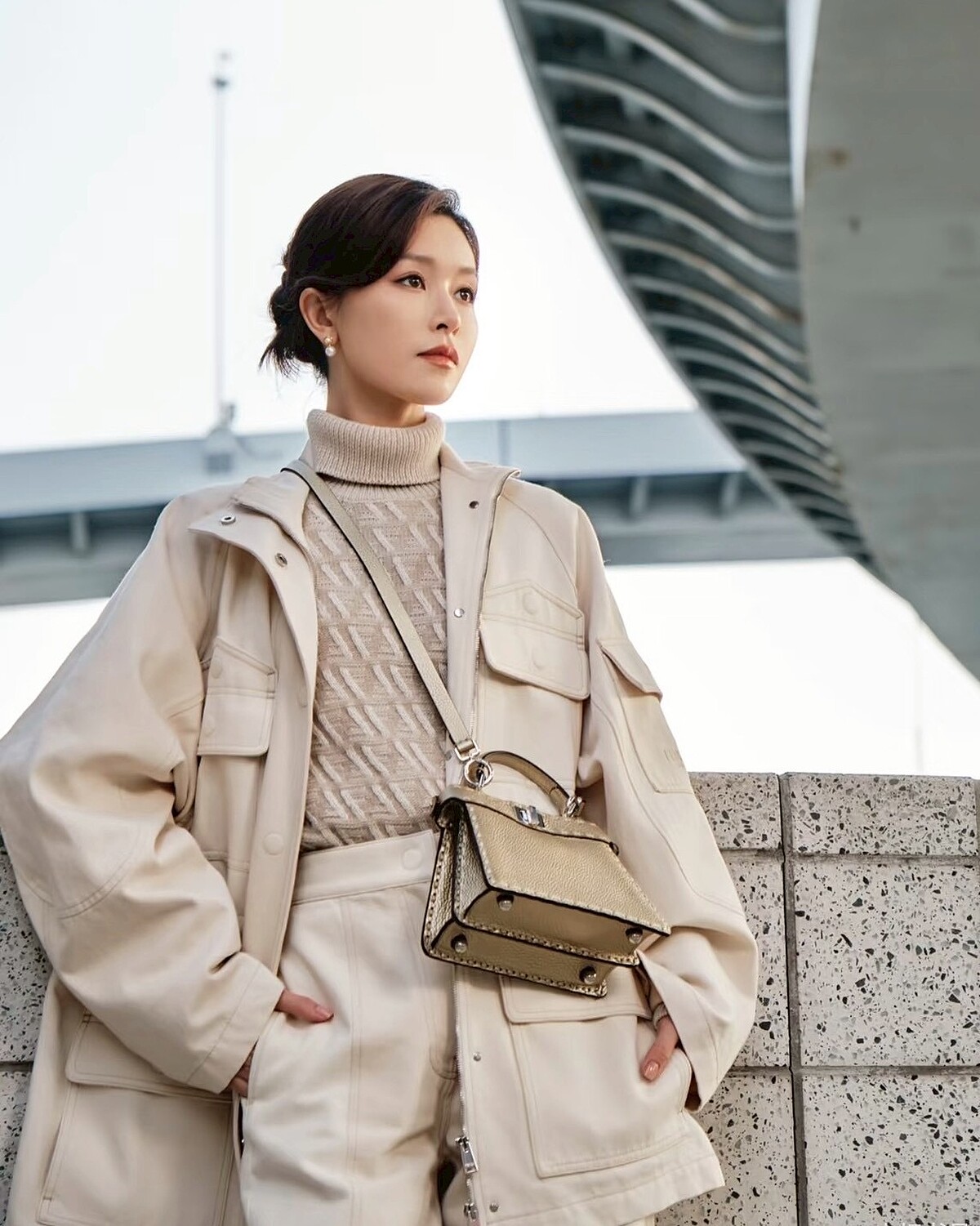 文詠珊也很常以FENDI的招牌包款進行搭配,自然不能錯過這顆經典的FENDI Peekaboo,她選擇小號金屬色版本Peekaboo ,而包身最吸引人的地方是獨特開闔設計,打開時能隱約露出內裡,猶如「躲貓貓」遊戲般可愛,增添一種隨性不經意的時髦感。文詠珊以低飽和度的裸色外套、針織高領與俐落褲裝疊搭,形成一種都會高智感風格,不僅能駕馭柔美,同樣能輕鬆掌握氣場。
