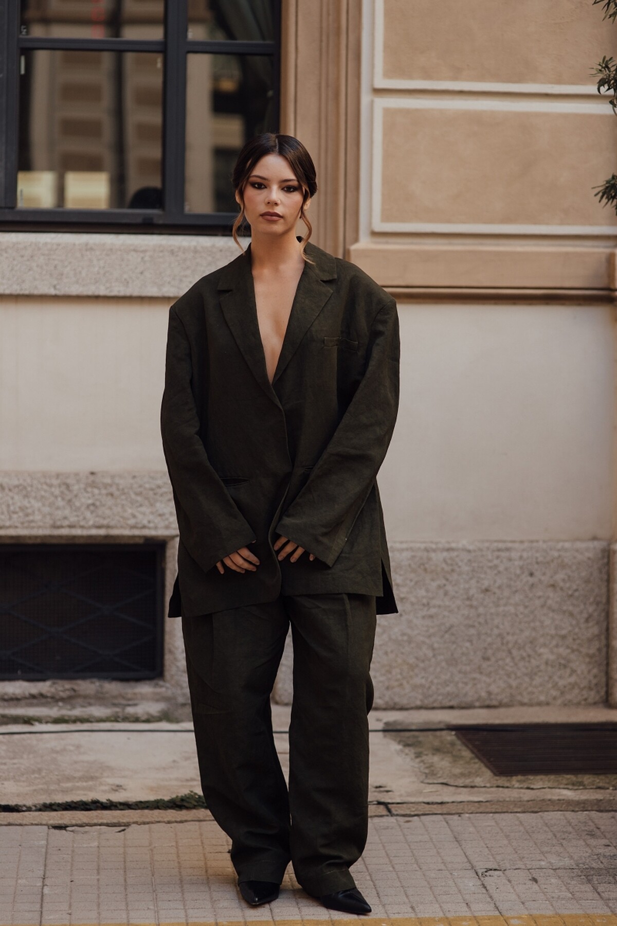一整套的同色系,打造「強勢但不失女人味」的氣場,Oversize 外套和弧形褲管碰撞,既有時髦的中性氛圍,又保持立體輪廓。