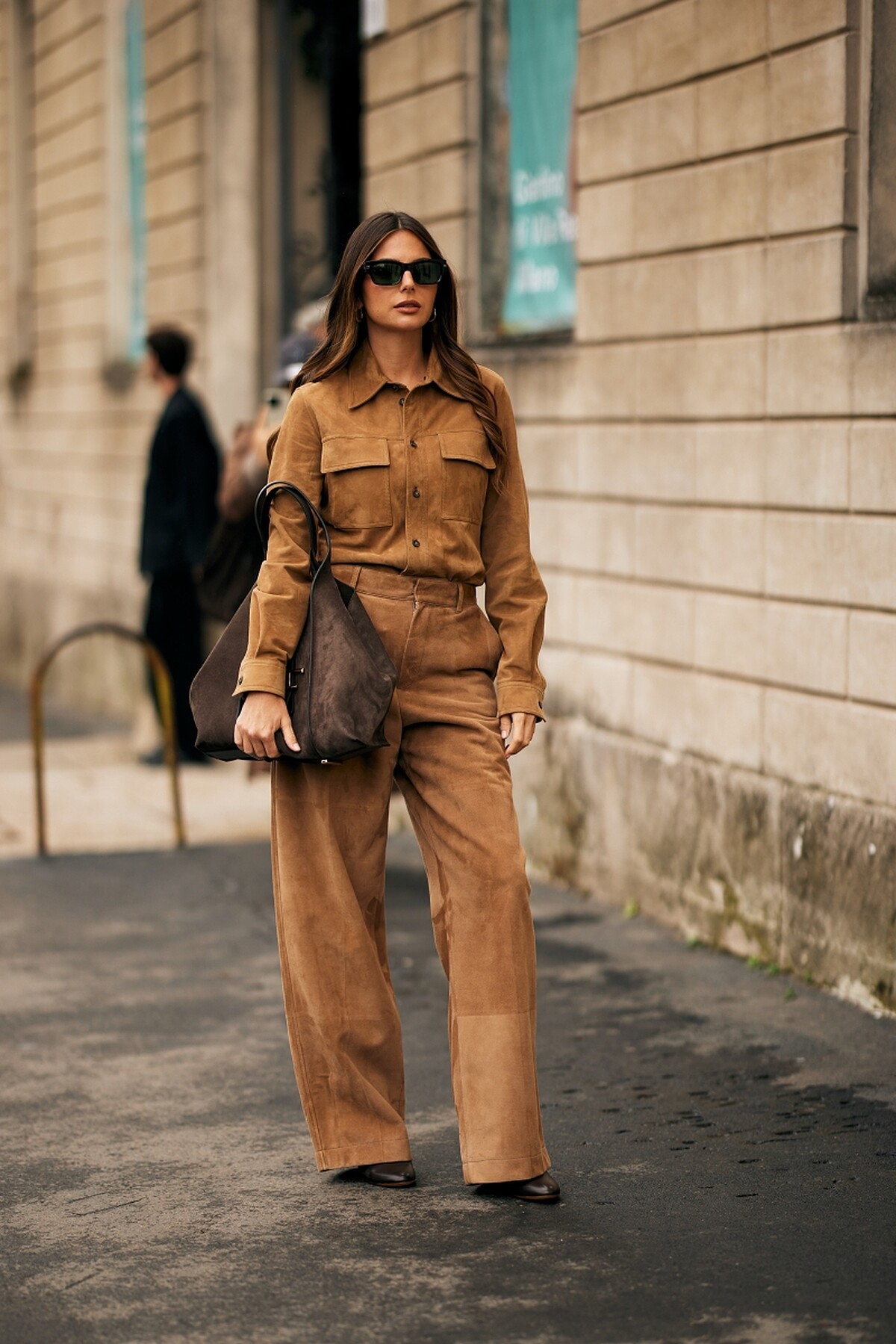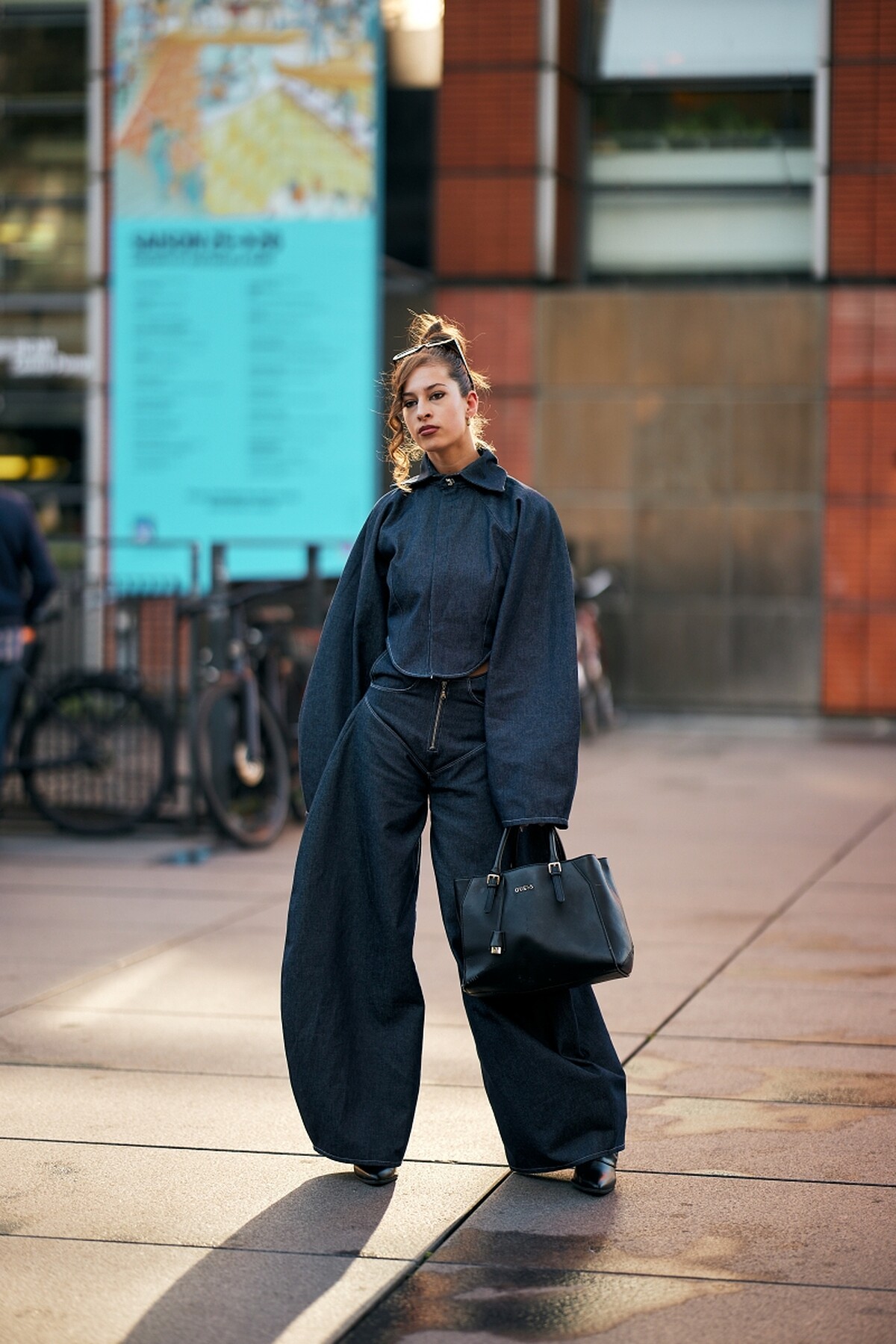 丹寧套裝搭配弧形剪裁的彎刀褲,營造出立體而具份量感的輪廓,整體線條俐落又有時髦態度,黑色手袋與尖頭鞋更是為整體增添幹練氣勢。