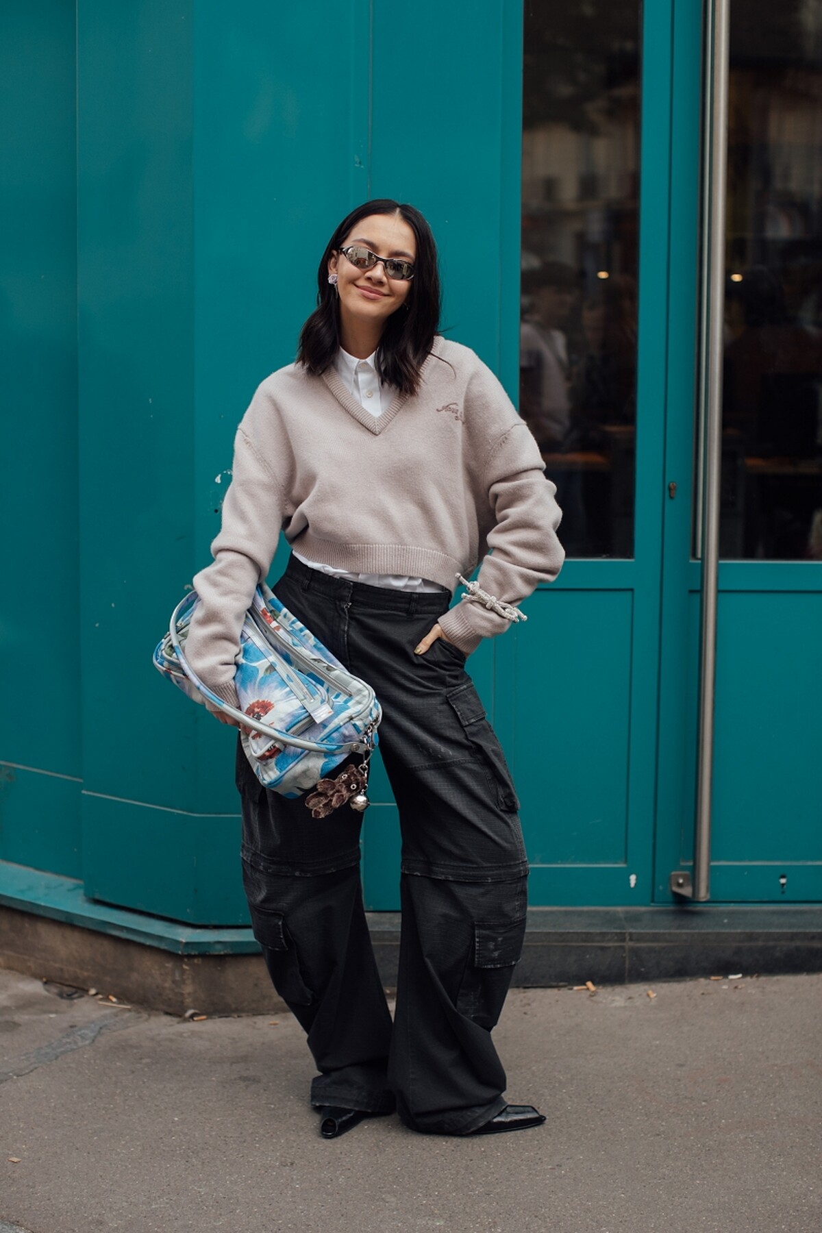 米色V領針織衫搭白襯衫內搭,營造層次與清新感,下身搭配黑色工裝彎刀褲,平衡柔與剛的比例,整體展現率性又帶點俏皮的都市休閒風。
