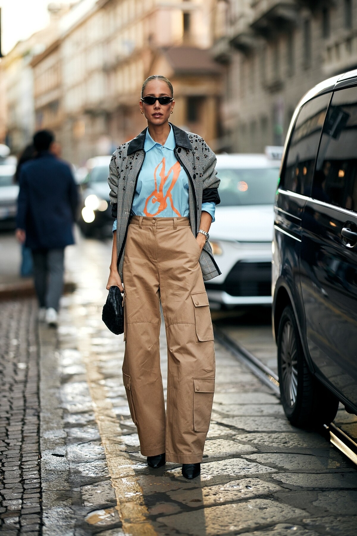 淡藍色印花襯衫搭配卡其色工裝彎刀褲,撞出俐落又具玩味的時尚感,外搭格紋拼皮革外套增添結構層次,整體呈現都會女性的帥氣率性風格。