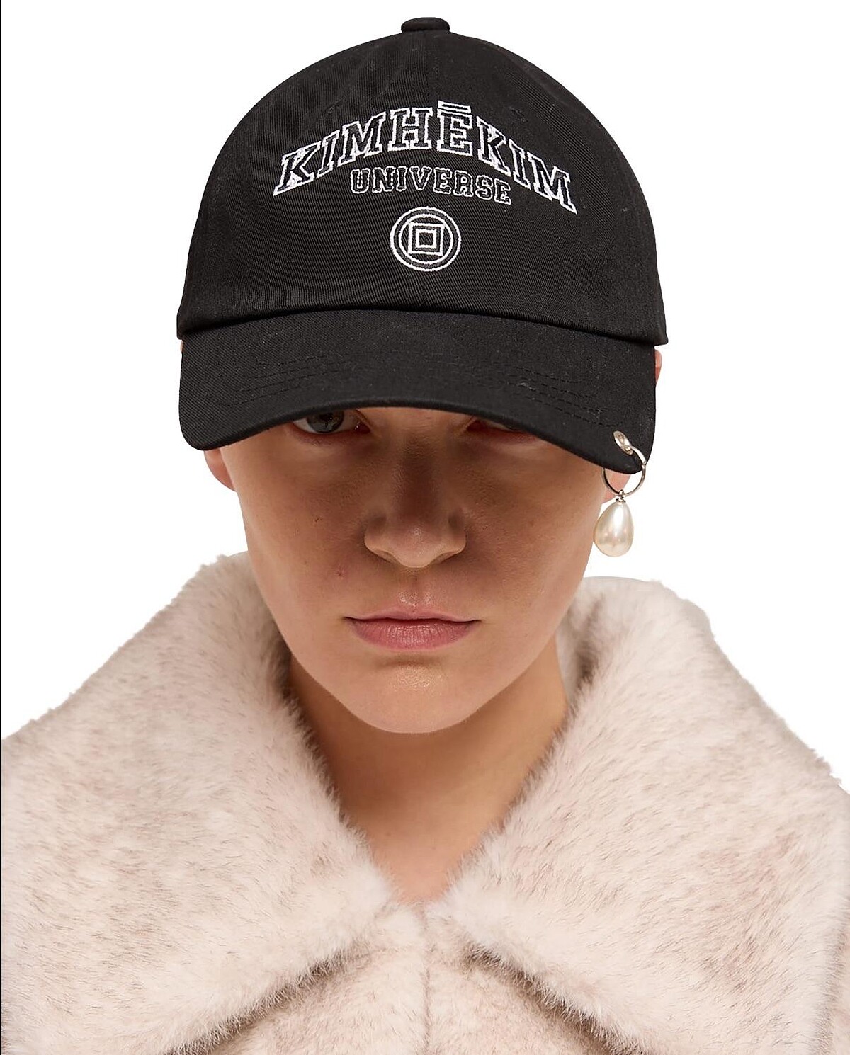 KIMHĒKIM所推出的珍珠系列當中,韓孝周還同時收藏了另一款棒球帽,足見她對這項設計的滿意度!於墨鏡同樣概念,將珍珠穿孔垂掛在帽簷邊緣,於千篇一律的字母刺繡棒球帽上直接點出特色,一眼就能看出是KIMHĒKIM的設計。