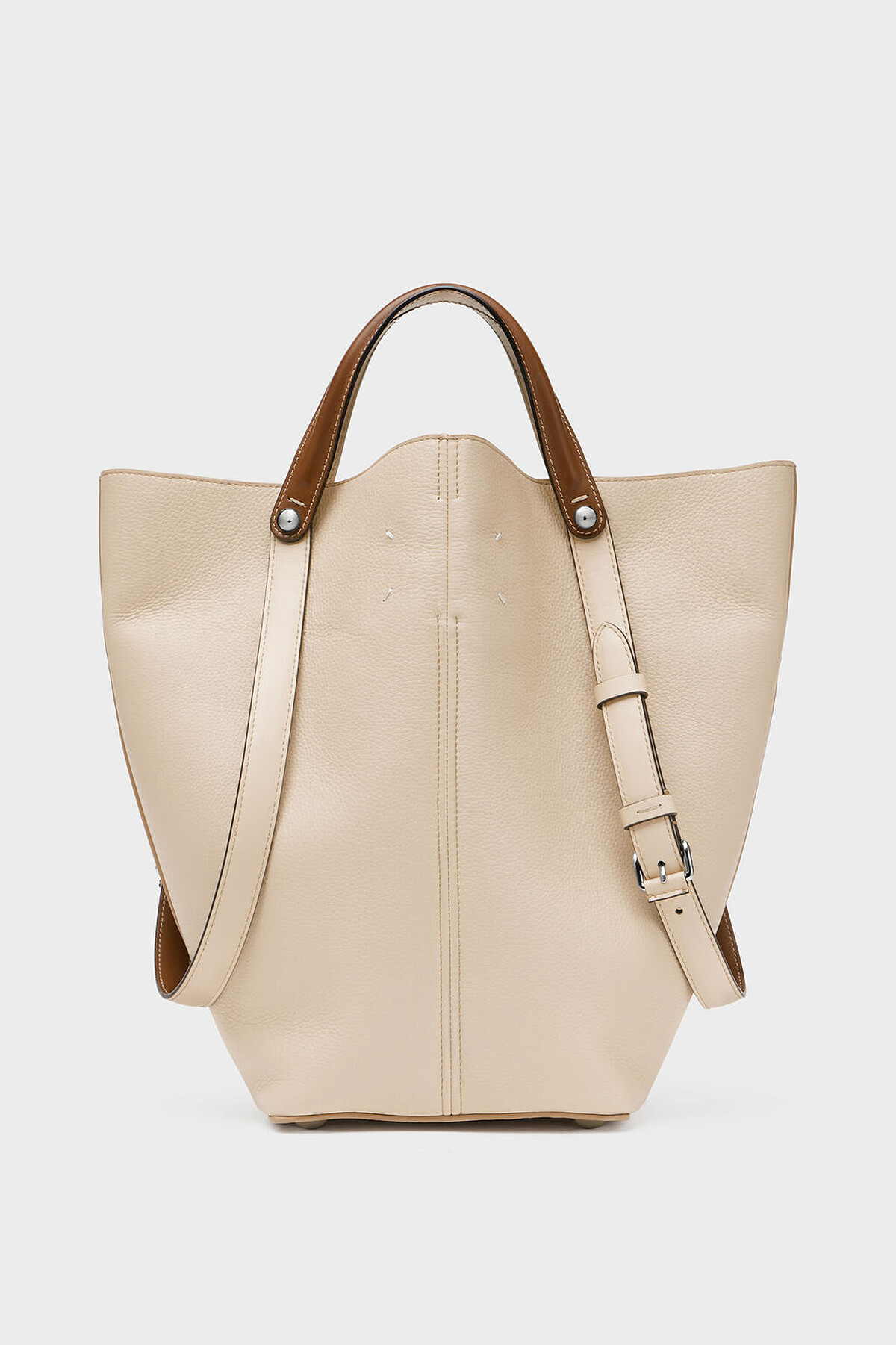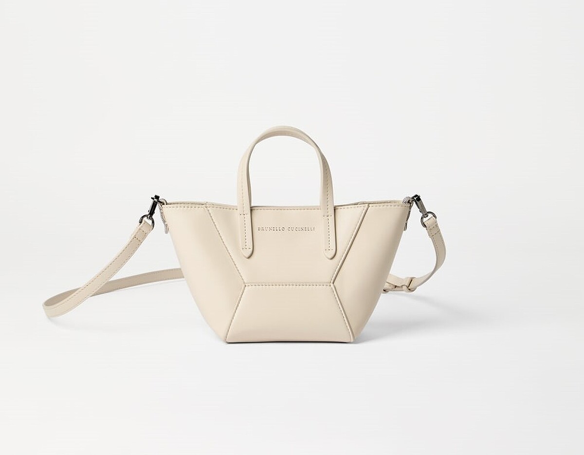 Brunello Cucinelli於2025年推出極簡實用的梯形托特包型BC Duo,幾何造型縫線為其特色,兩側則有鑲珠裝飾低調提升奢華質感,此包款從大至小共有四種尺寸選擇,韓孝周示範的迷你款式對於女孩們一般外出來說,空間已是綽綽有餘,手機與補妝用品皆能裝進,是日常的實用選擇。