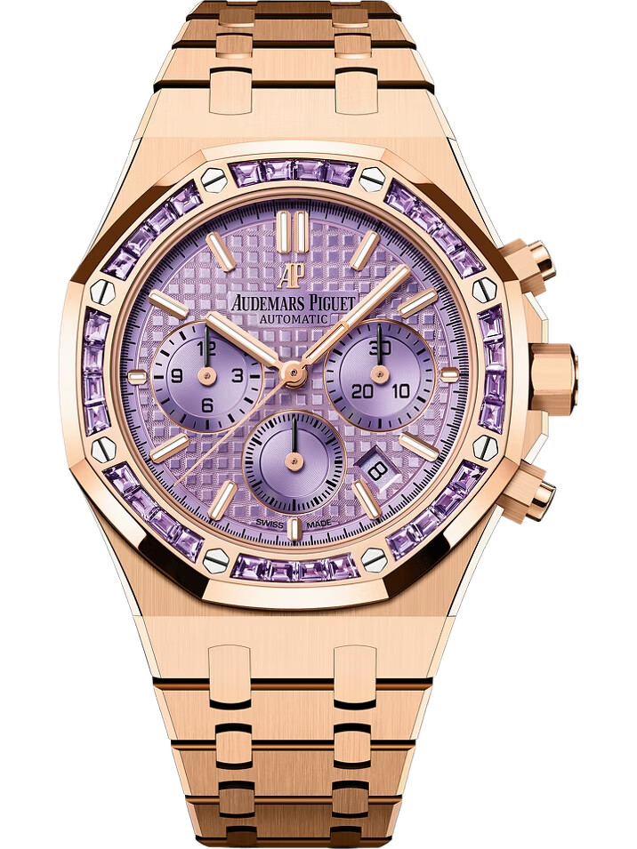 生日石腕錶推薦:AP愛彼Royal Oak皇家橡樹系列自動上鍊計時碼錶(Ref.26319OR),18K玫瑰金/錶徑38mm/鑲嵌32顆長方形切割紫水晶/自動上鍊機芯/參考售價$3,096,000