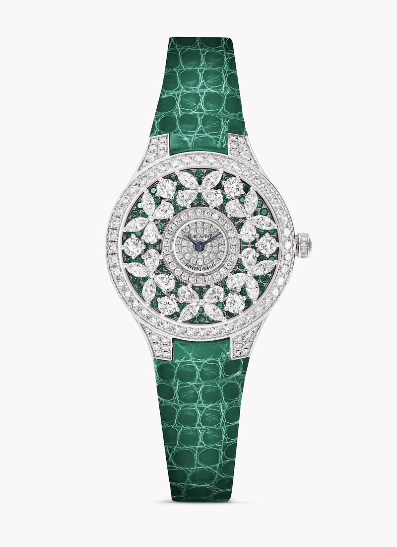 作為5月生日石的祖母綠向來代表重生與希望,Graff Classic Butterfly系列將標誌性的蝴蝶符碼放上腕錶,並以祖母綠為錶盤基礎,鏤空鑽蝶飛舞於錶盤上,與祖母綠充滿生命力的意象相呼應。梨形和馬眼形美鑽勾勒出優雅蝶翅,細膩重現蝴蝶的靈動姿態。錶圈、錶耳和錶冠皆密鑲鑽石,在祖母綠錶盤的襯托下熠熠生輝,錶背亦鐫刻多隻蝴蝶,在細節處展現巧思。