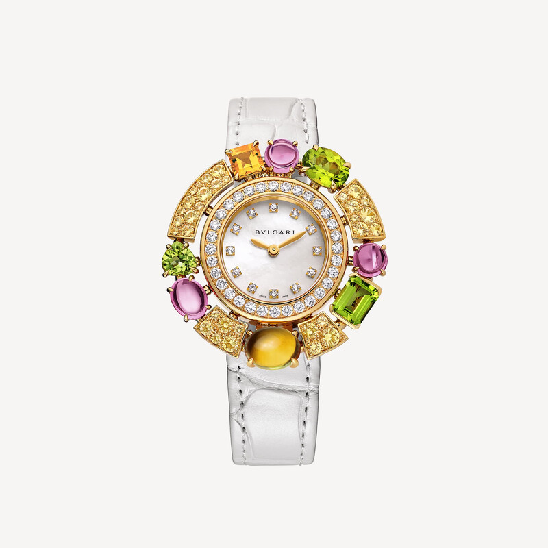 生日石腕錶推薦:寶格麗Allegra腕錶,18K黃金/錶徑36mm/鑲嵌鑽石、黃色藍寶石、粉紅碧璽、黃水晶、橄欖石/石英機芯/參考售價$1,000,000