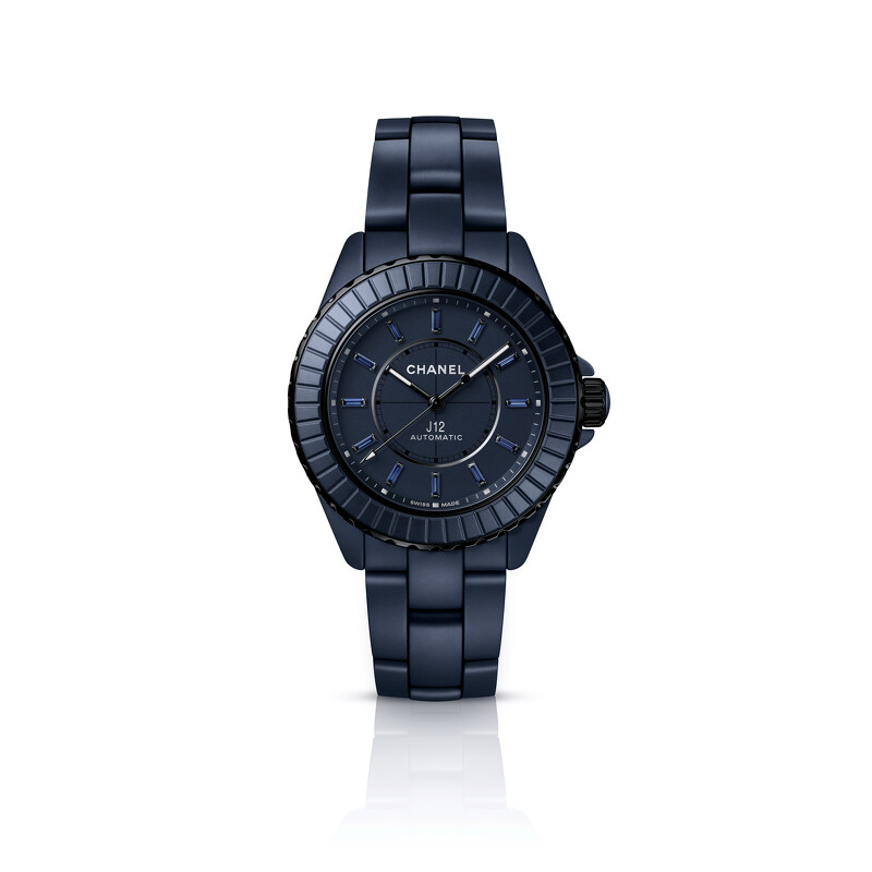 生日石腕錶推薦:香奈兒J12 BLEU Caliber 12.1機芯腕錶,霧面藍色高抗磨陶瓷和黑色塗層精鋼錶殼/錶徑38mm/鑲嵌藍色藍寶石/自動上鍊機芯/參考售價$874,000