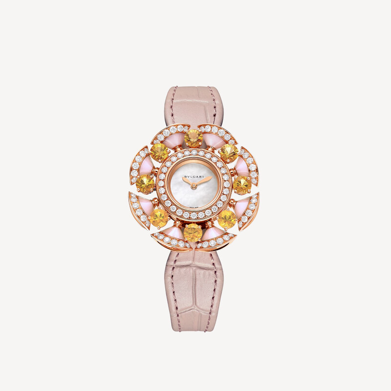 象徵溫暖和豐盛的黃水晶是11月的生日石,Bvlgari將黃水晶融入Divas' Dream腕錶,以品牌誕生地——羅馬卡拉卡拉浴場的扇形馬賽克地磚為靈感,粉色蛋白石、鑽石形成的扇形花瓣輪廓,圍繞著珍珠母貝錶盤,黃水晶如同溫暖朝陽錯落其中,帶來明媚活力,將義式風格獨有的優雅與歡愉融入腕錶中。