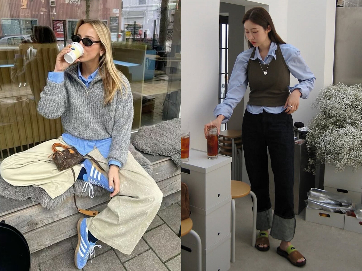 藍色系襯衫和秋冬必備的灰色毛衣or背心,都是唾手可得的日常單品,將兩者疊穿,便成了最簡單的「灰色+藍色」穿搭公式,在博主們之間也是非常熱門的一款造型。外層選擇寬鬆的毛衣,自帶溫暖休閒的冬季日常氣息;若是用合身的灰色背心來搭配,則能一秒化身知性優雅的韓系小姊姊。