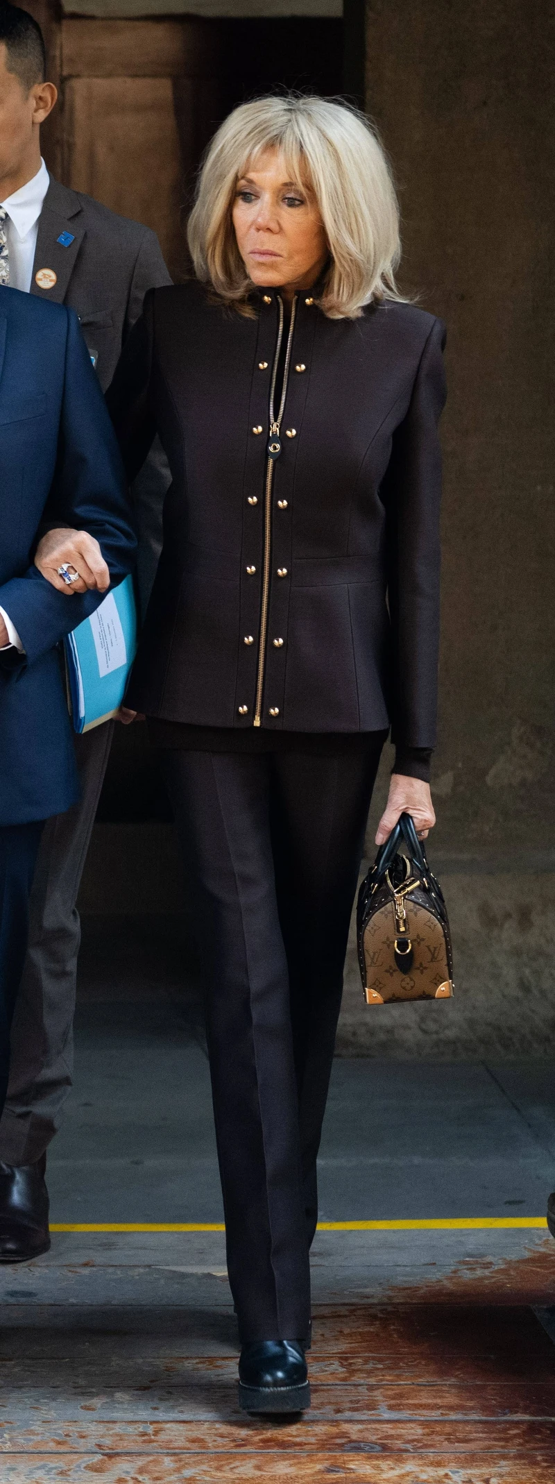 碧姬·馬克宏Brigitte Macron身穿的棕色雙層羊毛絲綢夾克飾有金色拉鍊和鉚釘細節,隱隱透露低調奢華氣息;搭配同色系喇叭褲,在中性風格中展現自信魅力,搭配 Monogram Speedy Trunk 手提包讓整體的摩登風格更完整。