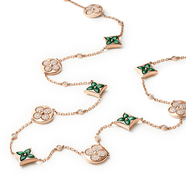在珠寶造型上,Brigitte Macron 經常選擇 Color Blossom 高級珠寶系列。該系列自 2015 年推出,以 1896 年喬治・路易威登所構想的 Monogram 花朵為靈感,透過體積與色彩的變化重新演繹經典符號。白色與粉紅珍珠母貝、紅玉髓、孔雀石、縞瑪瑙與天河石,搭配玫瑰 K 金與黃 K 金,形塑層次豐富、充滿生命力的寶石語彙,致敬跨越時代的工藝美學。