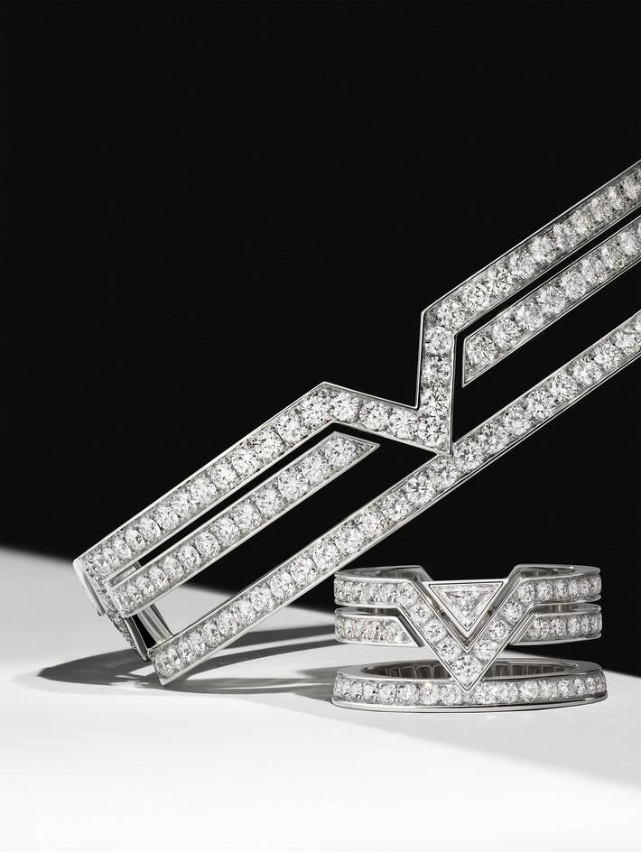 而 Pure V 頂級珠寶系列則展現截然不同的力量美感。設計師靈感源自 1920 至 1930 年代,Gaston-Louis Vuitton 將 V 字運用於行李箱裝飾的設計語言。大膽而純粹的 V 字線條,透過上下延伸的筆畫構築出建築感輪廓,彰顯極簡、現代且充滿張力的品牌精神。