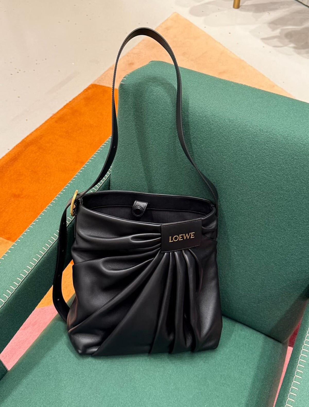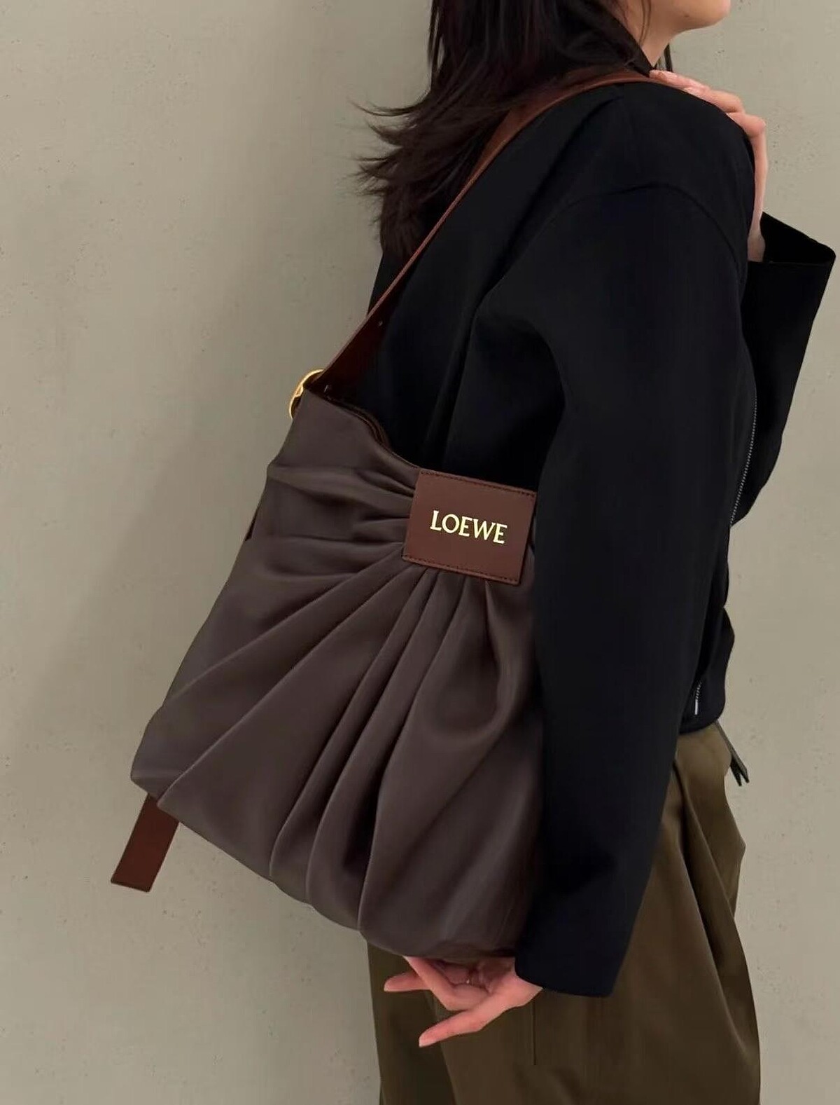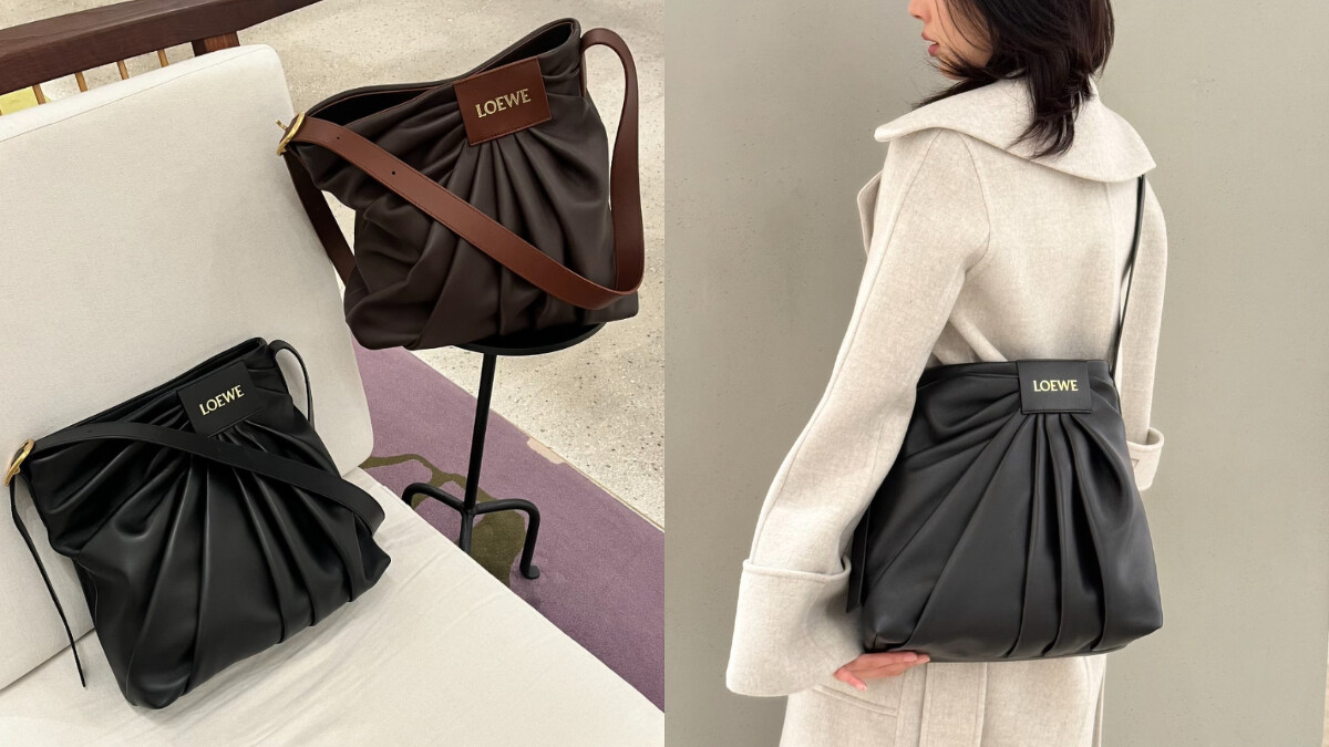 以不對稱皺褶搭配燙金皮標的設計,已被視為是Jonathan Anderson簽名般的存在,令人沒想到的是,在秋冬季節Loewe將這款爆紅的皺褶設計,從服裝中獨立出來、化身為手袋,效果更是出奇的時髦!
