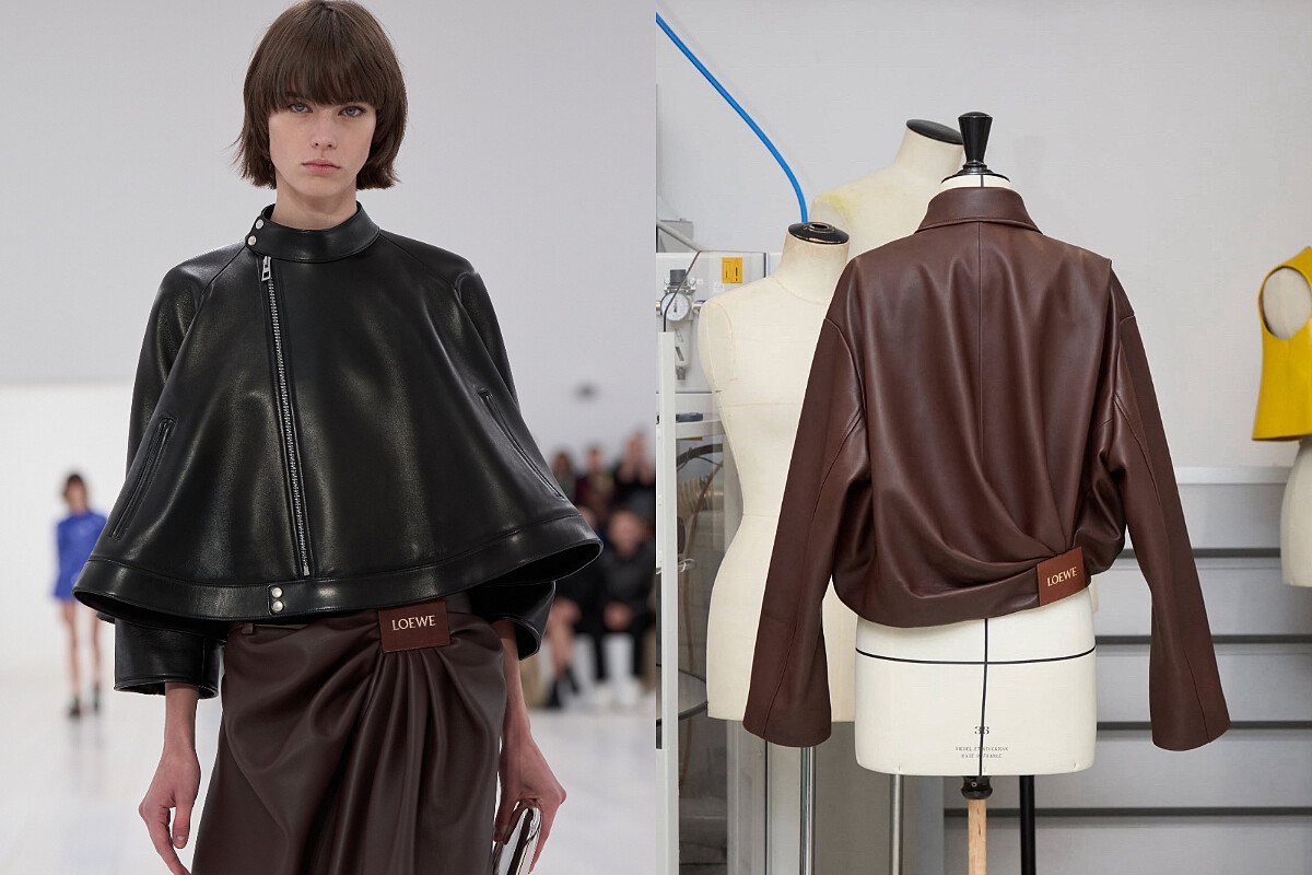 前任創意總監Jonathan Anderson於2025春夏系列中,有數套服裝皆採用相同垂墜概念的造型,其中這件皺褶夾克更是掀起不小話題,官方也特別公開製作過程,呈現出將皮革切割折疊出優雅線條的細節,以及巧妙點睛的燙金皮標,打造出不對稱的獨特美學,同樣的設計也被運用於褲裝、裙裝……。