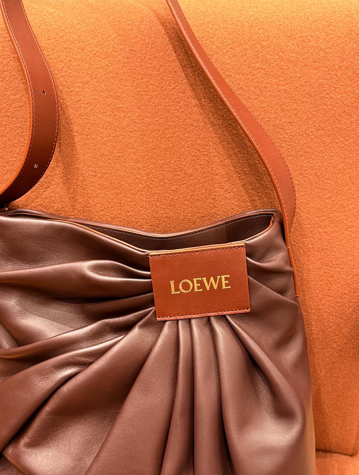Loewe Draped Tote以Nappa小羊皮打造,光滑柔軟的皮質主導溫潤氛圍,再透過交疊抓褶手法,形塑出不規則而立體的線條,讓它即使擁有輕盈慵懶的本質,依然能體現雕塑般的美感。