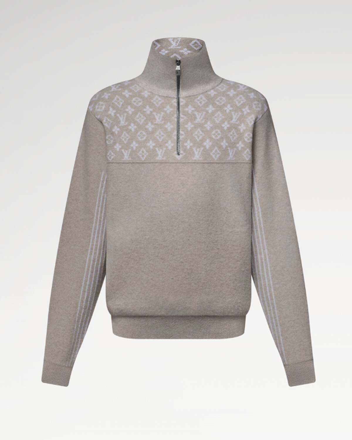 Louis Vuitton的Quarter-zip,展現的是高端休閒的時髦輪廓。 Beige 羅紋款的 Monogram 內襯細節將品牌符碼藏在細節中,它能搭配正式與休閒,也毫不違和。