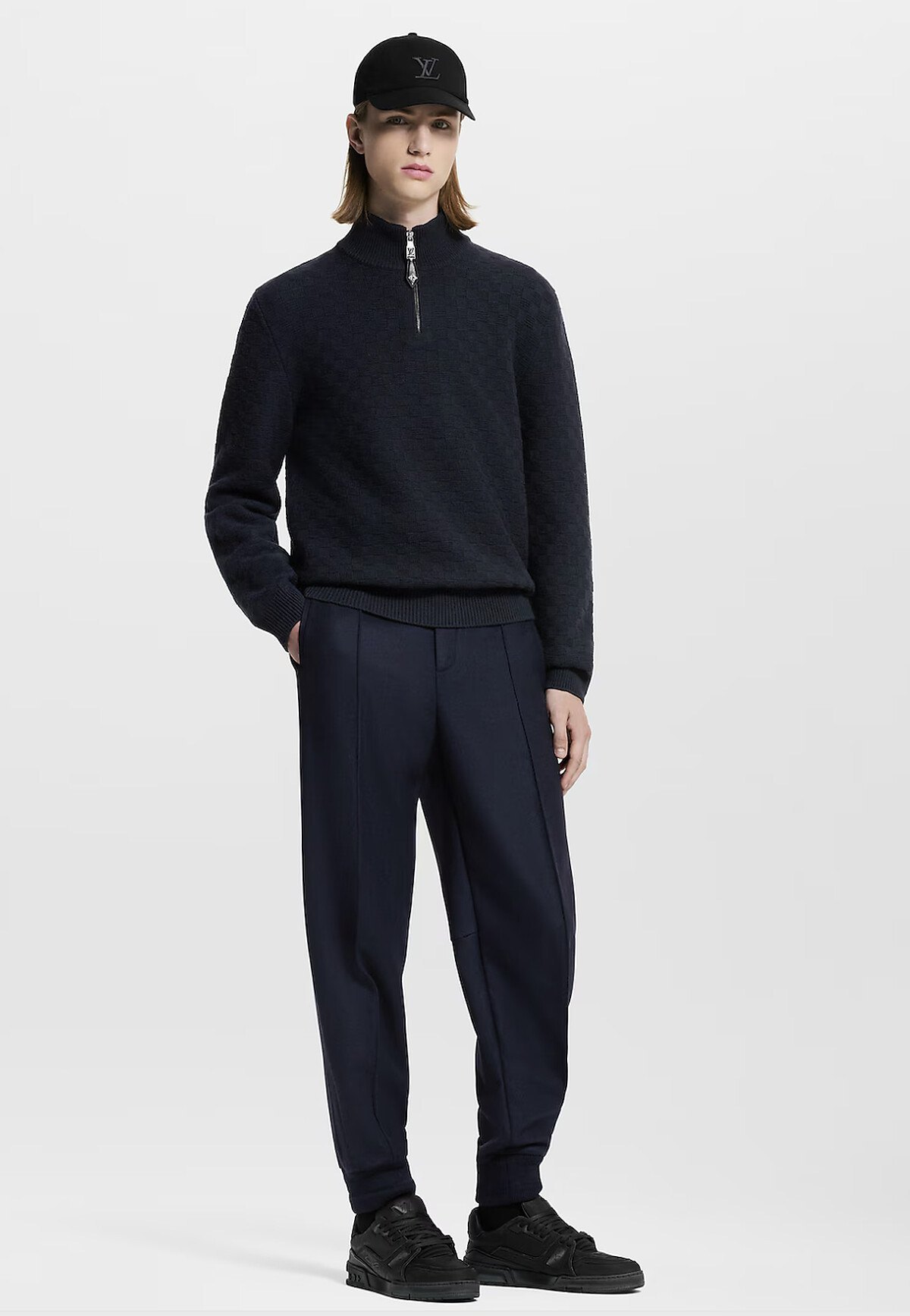 Louis Vuitton 這件Navy山羊絨羊毛混紡的Quarter-zip,有綴上低調的Damier圖案,同樣將品牌符碼藏在細節中,而無論正式或是休閒,又或是將裡面內搭襯衫、外面套上西裝大衣,都能展現優雅俐落的好氣質,是非常推薦的一件百搭上衣。