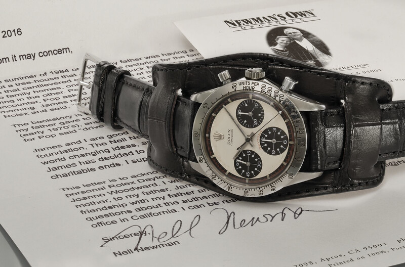 「老勞」玩家們的天花板等級收藏,甚至是不熟悉鐘錶拍賣的人也曾聽過的傳奇腕錶!美國奧斯卡影帝保羅.紐曼(Paul Newman)擁有過的這只勞力士Daytona ,以1775萬2000元美金拍出(以現匯率換算約新臺幣5.55億)創下紀錄,為當代傳奇腕錶之一。「保羅.紐曼」Daytona Ref. 6239腕錶是品牌第一枚Daytona計時款,使用被稱之為帶有「異國風情」(Exotic Dial)的面盤,黑、白對比色,周邊刻度以黑、白及紅作對照,此漆面久經使用、陽光照色下,都會略微變色、裂變出獨特的泛黃奶油質感。其小錶盤上小巧可愛的方形小旗,呼應賽車旗,讓他在亞洲藏家間有「骰子面」的暱稱。拍賣會過後,亦引發一波初代Daytona系列收藏熱潮,老錶有人關注,系列新錶也再度成為流行炫風,成為不少人的必收款。