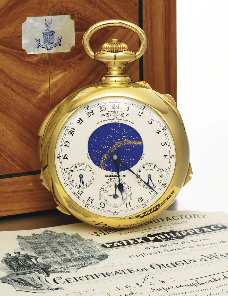 有世界最貴腕錶,自然要有最昂貴懷錶。「錶王」百達翡麗在此當仁不讓,一枚由大藏家Henry Graves Jr.於1925年委託品牌所訂製的「世界最複雜懷錶」,其拍賣紀錄迄今仍未打破。近代最新的紀錄停在2014年11月蘇富比日內瓦的秋拍上,一位匿名人士以高達約2,400萬美金(約新臺幣7.44億元)的價格成交,在該年創下世上最高價拍賣腕錶,以及至今尚未被打破的世上最貴懷錶紀錄。此枚超級複雜功能懷錶,是目前人類在沒有電腦3D建模、試算輔助的狀況下,純以手工所能創造的最複雜時計,很長一段時間都被譽為「鐘錶界聖杯」。坐擁24項複雜功能、包含西敏寺鐘聲三問、萬年曆,還有最初委託的美國銀行家Henry Graves Jr.在紐約第五大道的寓所上空的那片星空圖。