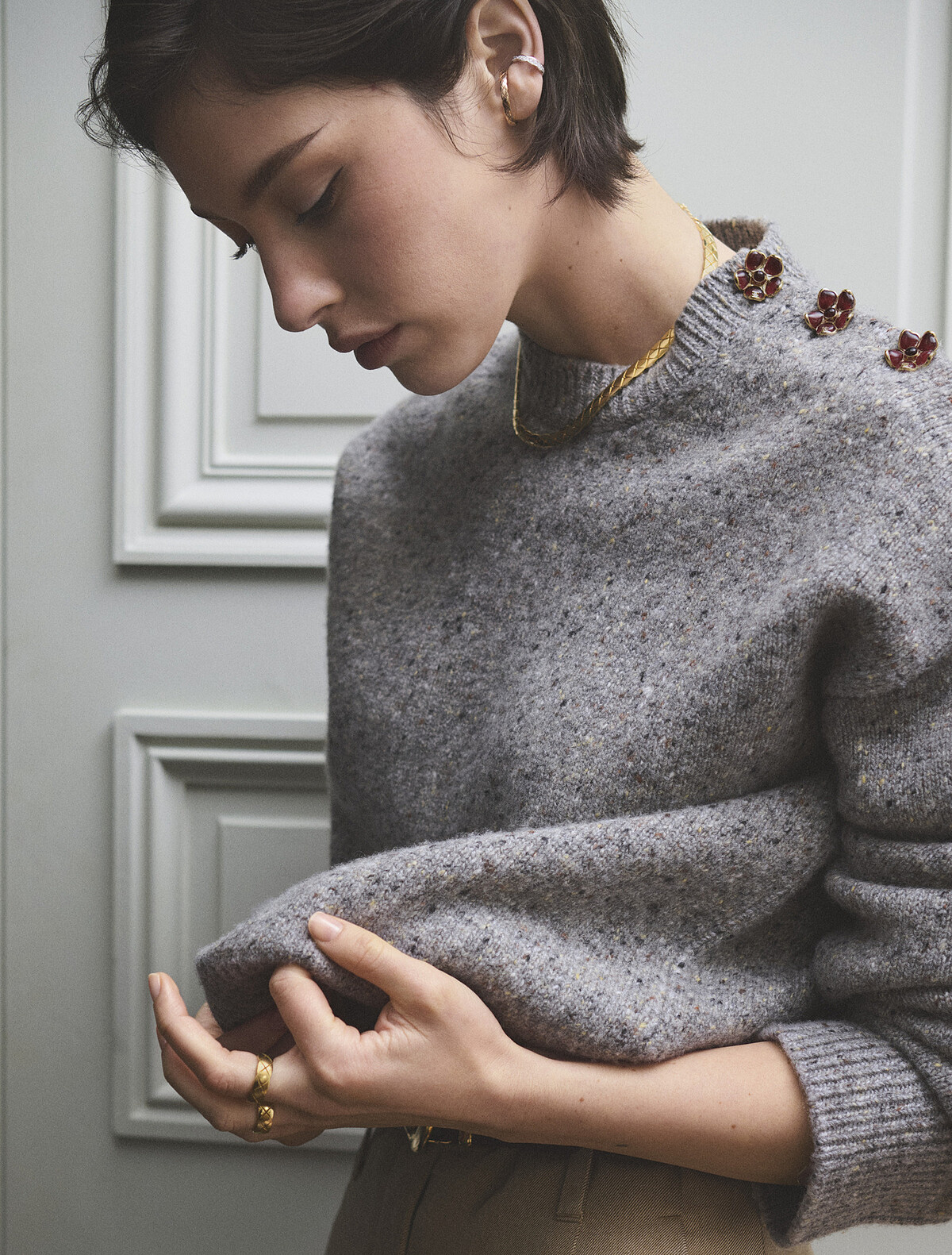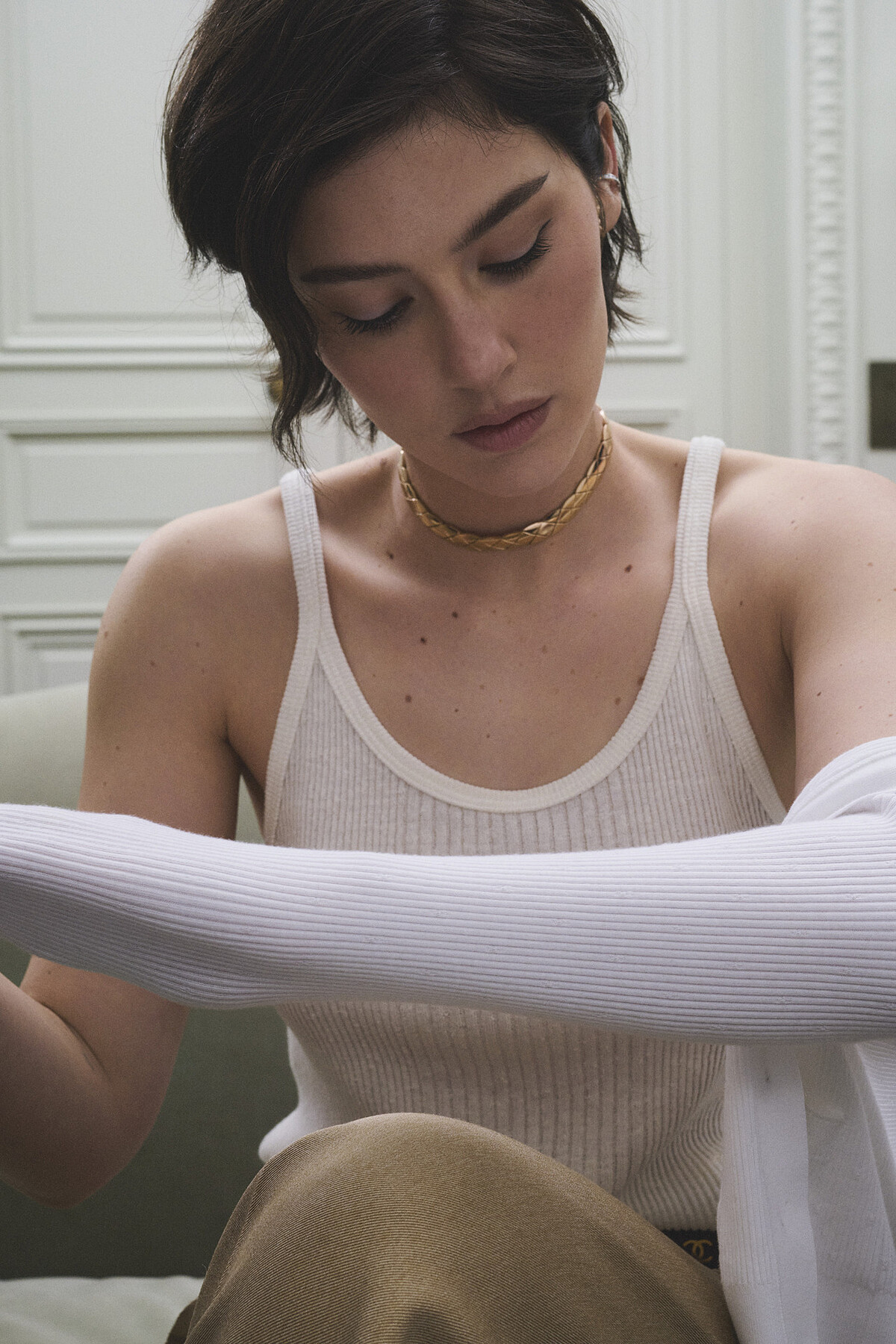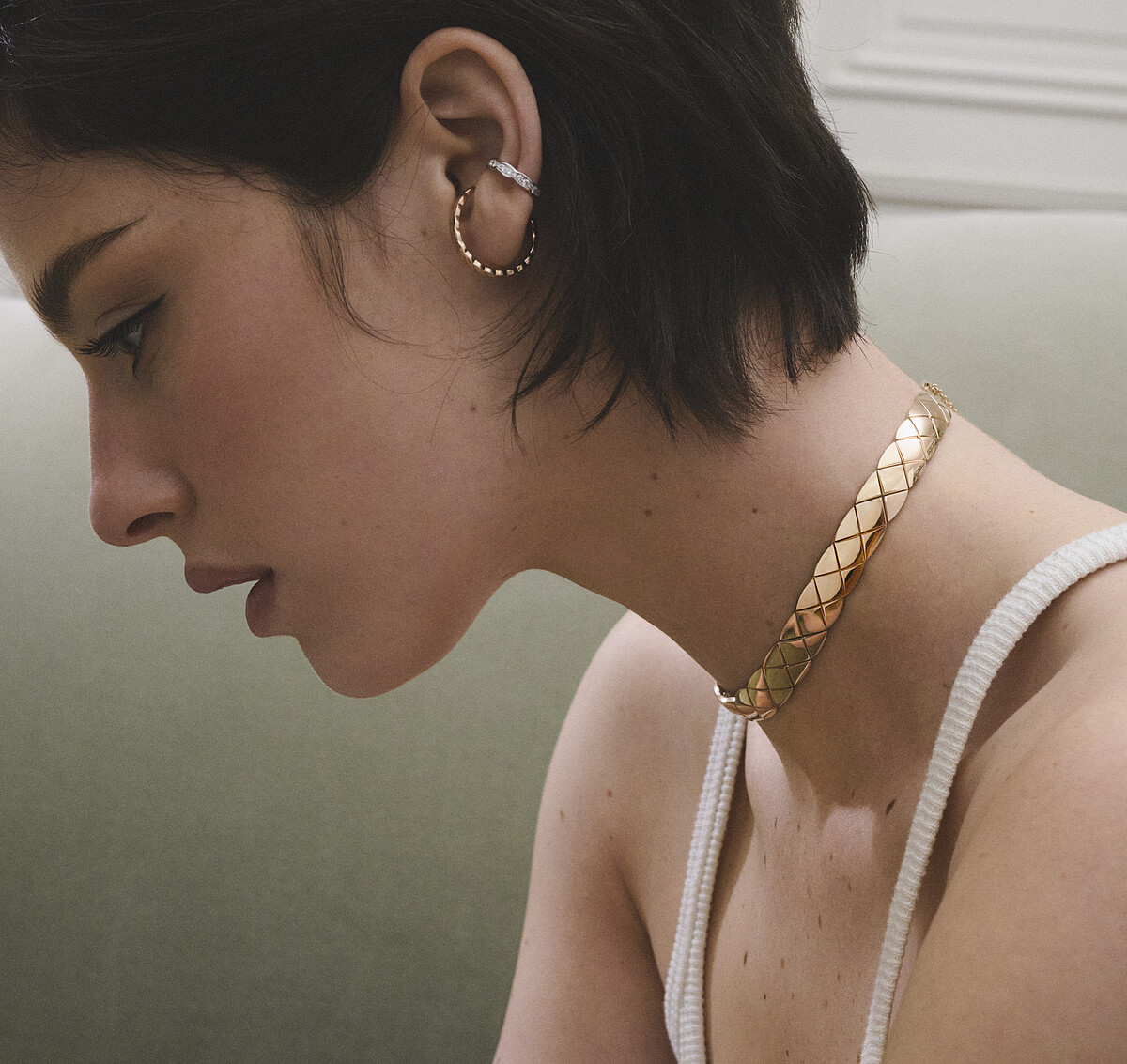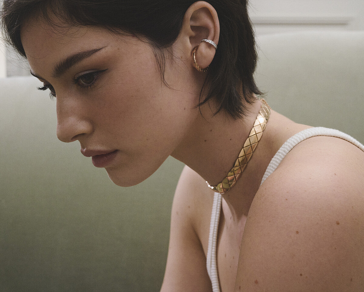 Coco Crush高級珠寶系列的飾紋源自經典菱格紋(Matelassé)圖騰,那原本運用於騎師夾克及馬鞍皮革上,講究比例均衡的簡約線條,成為彰顯珠寶的深刻工藝,並帶來一種「不費力、不需刻意解釋」的風格——純粹、率性、自然、能包容也充滿力量。就像是首波釋出形象照所捕捉的她,一張低頭靜思的側臉照便可感受她的剛與柔、態度與仙氣。而那條以服貼柔軟形式,表述著韌性與自信的貼頸短鍊,以及搭配的耳骨夾/耳掛等年度時髦珠寶新作,也難怪立刻在社群上引發討論!而在更多視覺影像的合作與Coco Crush年度新品正式揭幕之前,暫且拭目以待吧。