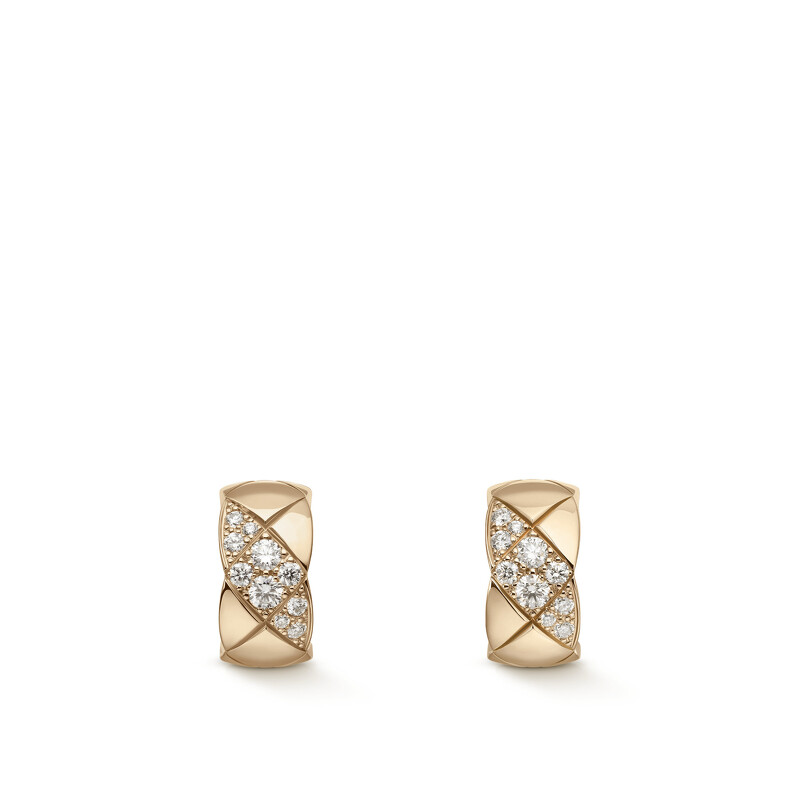 COCO CRUSH 耳環 18K 黃金菱格紋圖騰,鑲嵌 20 顆總重約 0.3 克拉明亮式切割鑽石。 建議售價 NTD 231,000 元