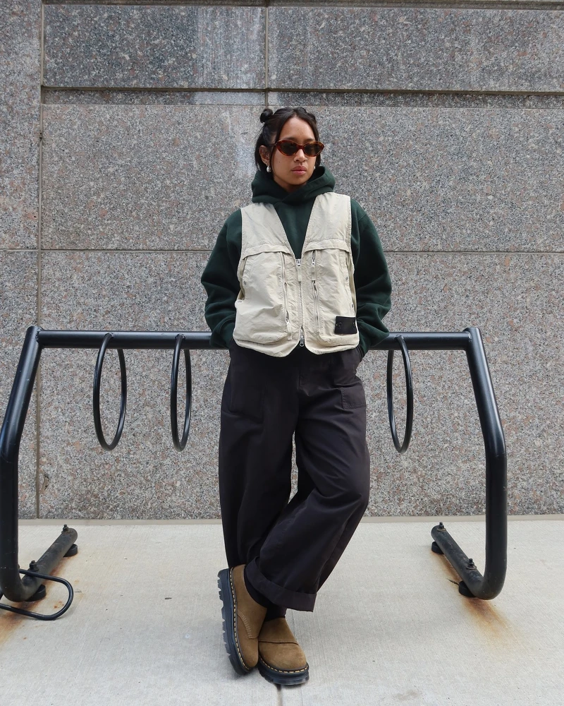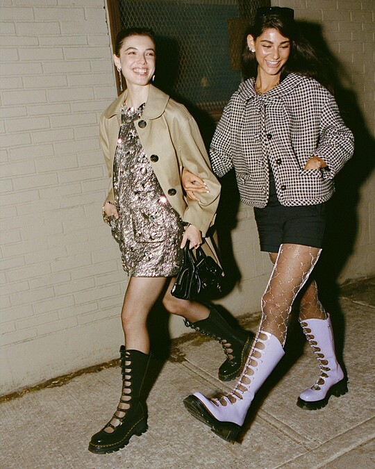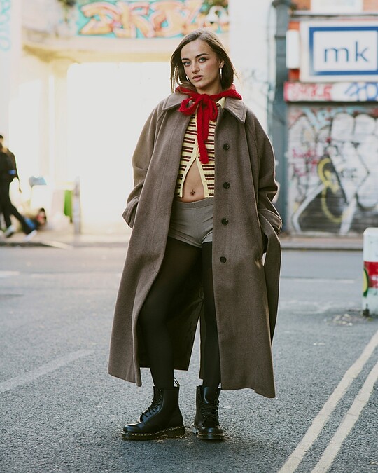 秋冬是穿大衣的絕佳時機,大衣寬鬆且富有垂墜感的版型,透過馬汀鞋能讓造型更加收斂、有秩序。鞋款式可依照整體穿搭做挑選,1461、樂福鞋、穆勒鞋或瑪莉珍鞋可搭配長襪平衡比例;想營造更強烈的氣場,也可選擇經典的 1460 長靴。
