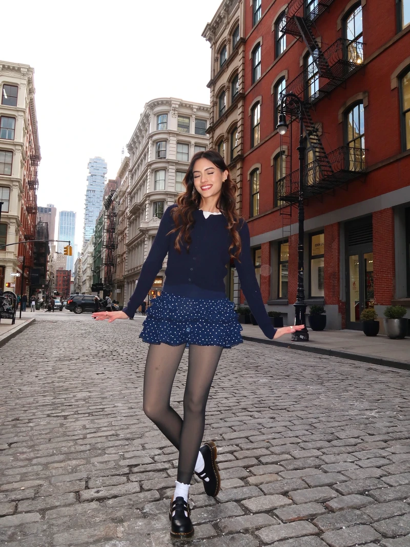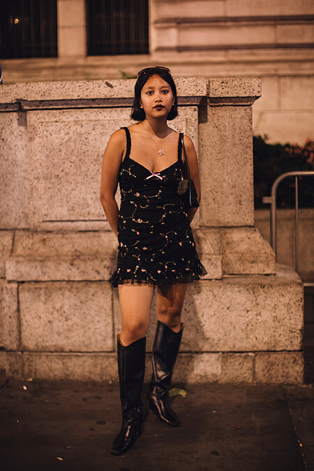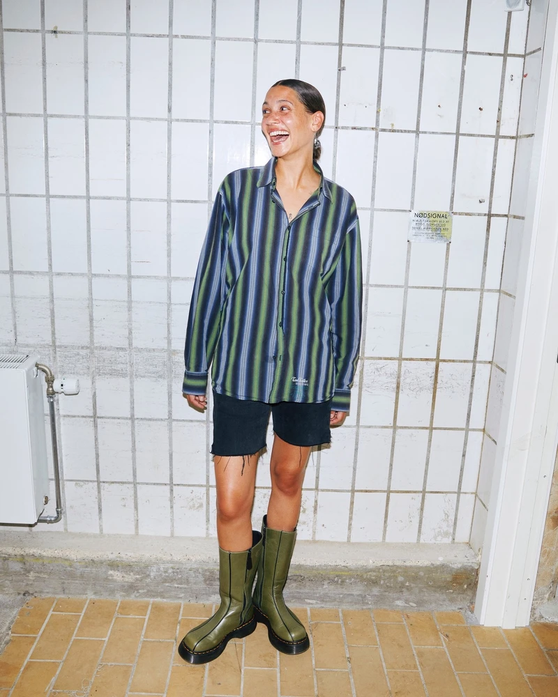 連身短裙本身帶有俏皮活潑的氛圍,屬於少女感較強的單品。想要呈現甜美風格,選擇低筒馬汀鞋搭配長襪是最保險的組合;喜歡中性風格,可以搭配 1460 八孔靴,為甜美氣質注入街頭酷感。穿長靴時,可以搭配比鞋筒長的襪子,並露出一小截,增加造型層次感。
