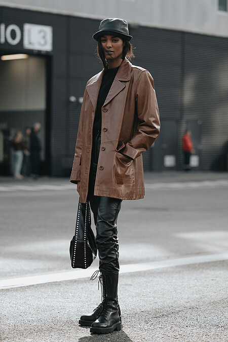 緊身皮褲的存在感強烈,能夠凸顯腿部線條,適合搭配高筒馬汀鞋,打造帥氣又有份量感的街頭造型。依照上寬下窄的穿搭原則,上半身可選擇寬鬆的 T 恤、毛衣、皮衣或大衣,不僅可以再次強化腿部線條,還能平衡穿搭比例並增加立體度。