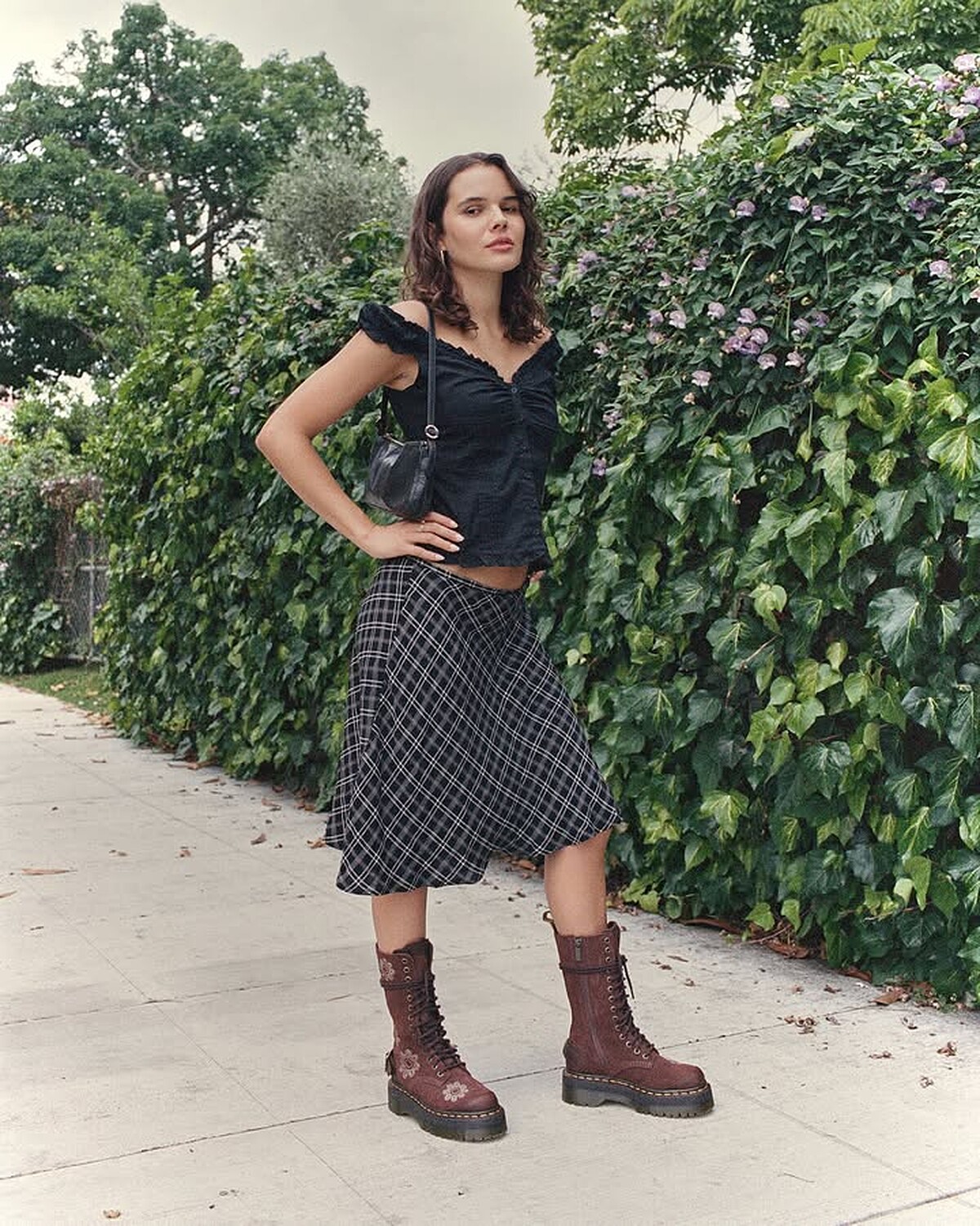 低腰裙自帶復古氛圍,無論長短都能凸顯腰部曲線,是復古風格中的經典單品。搭配高筒馬汀鞋能同時呈現性感與個性;選擇低筒則是看起來比較溫柔可人,還有助於減輕下身的視覺重量。