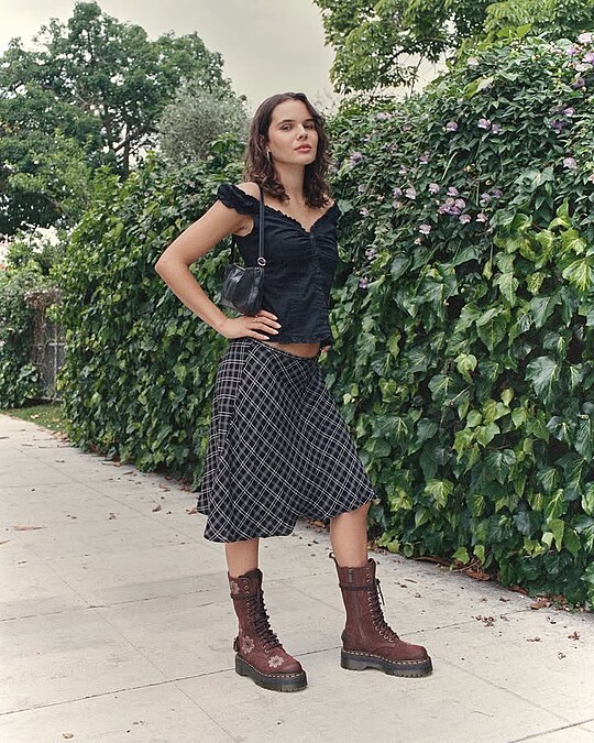 隨著 Balletcore 風格盛行,柔美的蛋糕裙也成為熱門單品。蛋糕裙不僅適搭配芭蕾舞鞋,也可以選擇 Dr. Martens 的瑪莉珍鞋,內搭印花或蕾絲襪子,讓造型更加精緻與完整。如果想呈現內斂的叛逆感,雙鞋帶的 8065 系列在小細節上展現獨特個性,非常適合。