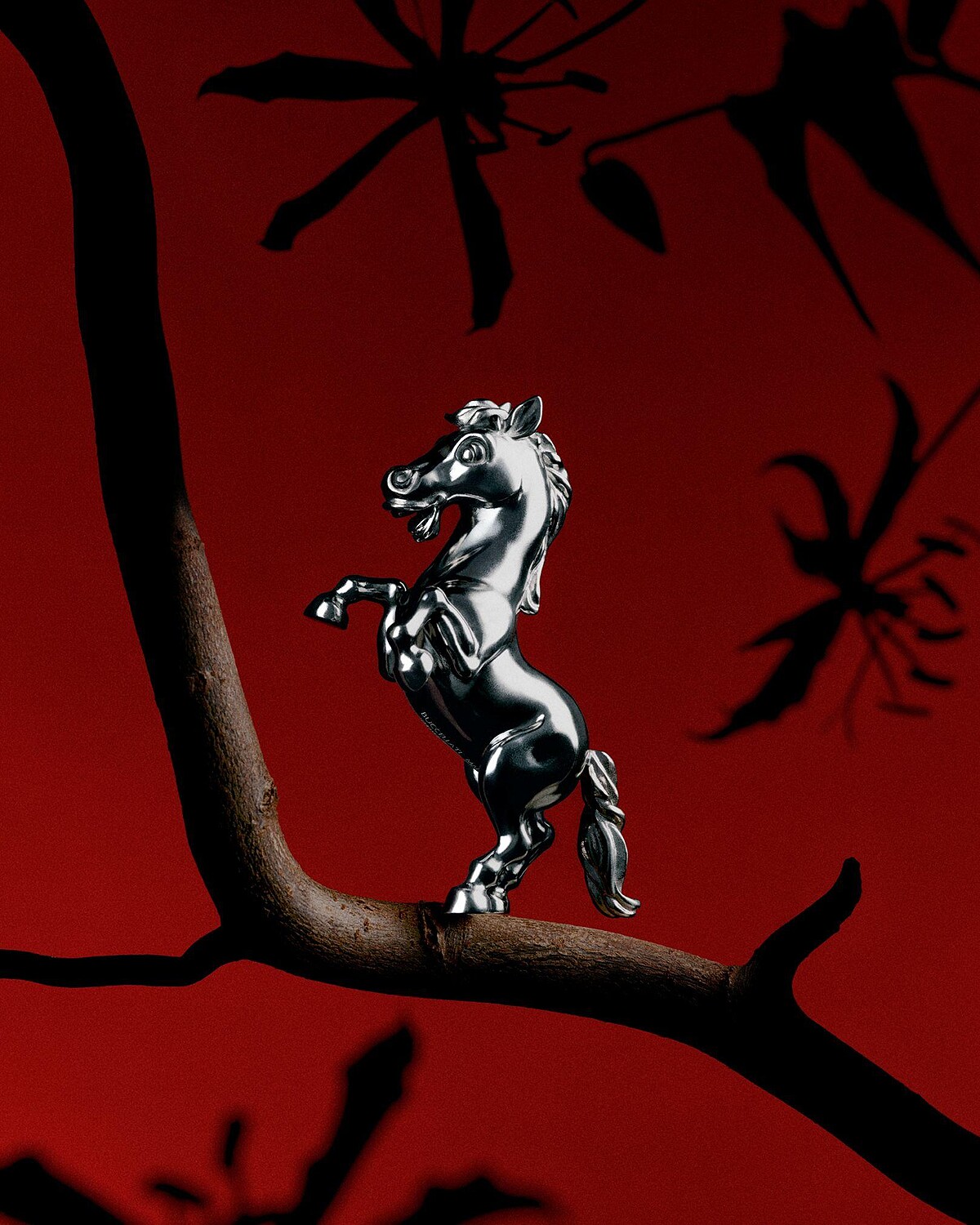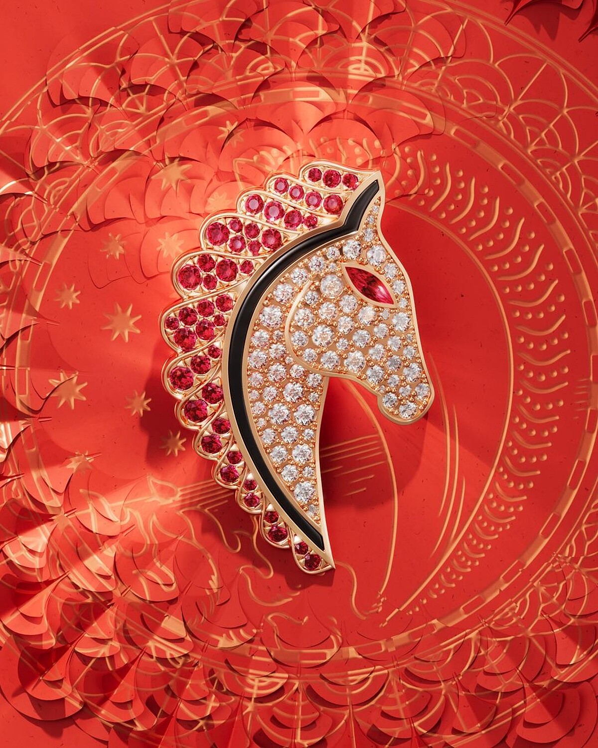 Qeelin 麒麟 Horse Bo Bo 高級珠寶作品,將一貫玩味風格的化作一匹幸運駿馬——奔騰的品採立雕呈現,鋪鑲鑽石與紅寶石,馬鞍懸掛三枚可動吉祥錢幣,輕移更能發出清脆響音,釕金屬塗層突顯馬蹄與馬鞍,系列標誌性「熊貓眼」以黑鑽鑲嵌。