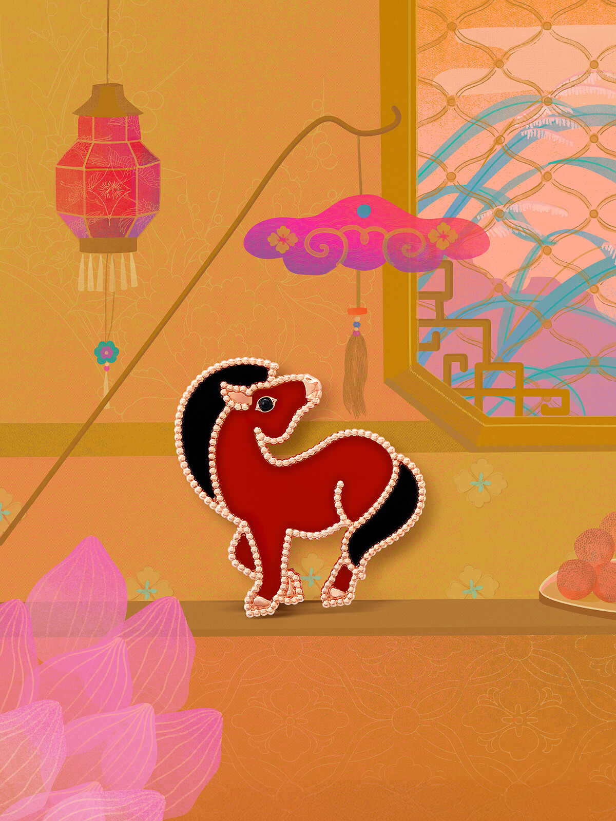 Van Cleef & Arpels 梵克雅寶Lucky Animals系列當中的馬兒胸針由18K玫瑰金與金質圓珠工藝打造飽滿圓潤的框邊,其中鑲嵌對比色彩的紅玉髓及縞瑪瑙,更顯靈動與童趣。