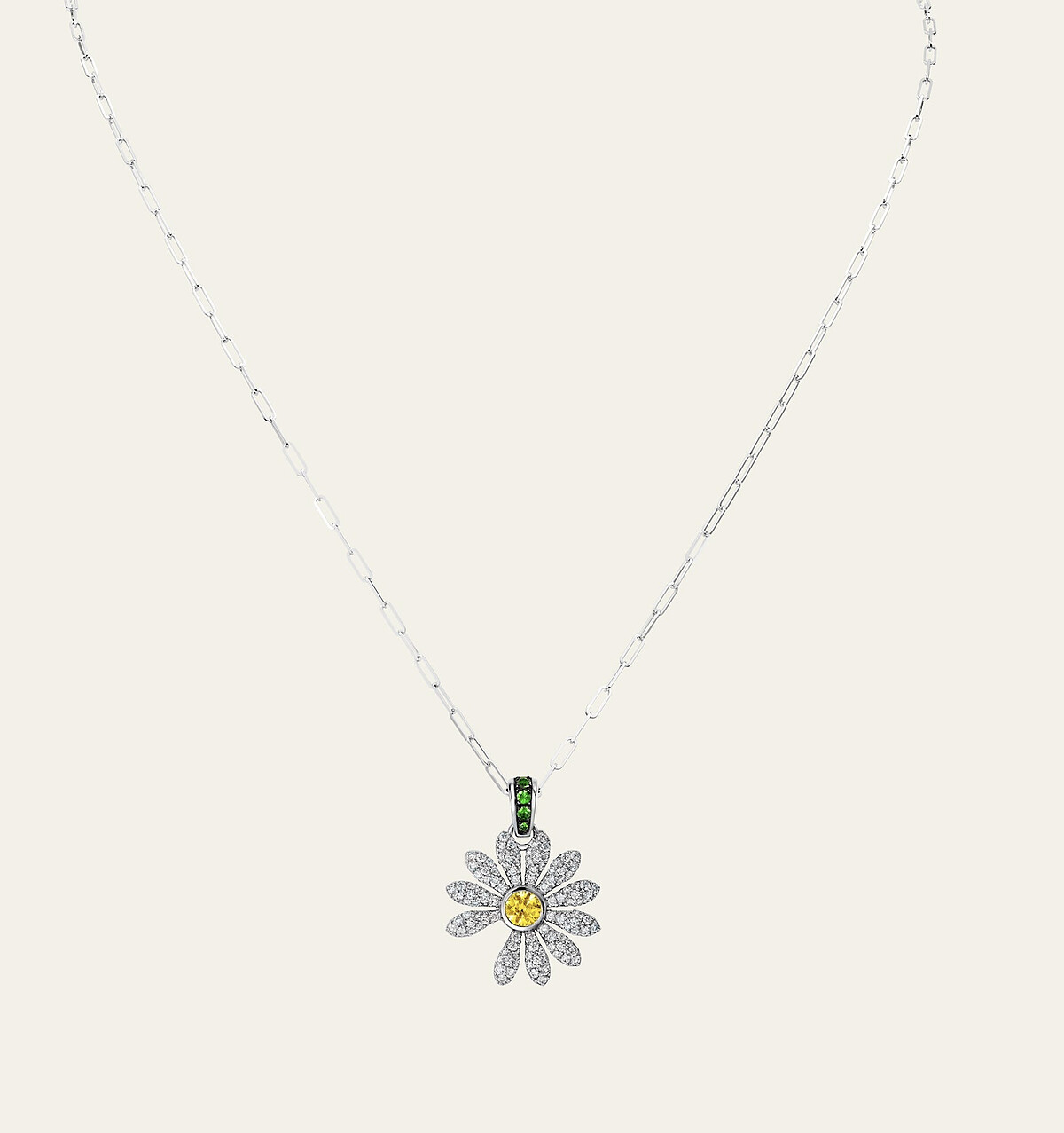 Jacob & Co. x PEACEMINUSONE小雛菊黃鑽密鑲吊墜,18K白金/鑲嵌白色鑽石、沙弗萊石、艷彩黃鑽/售價約$355,000