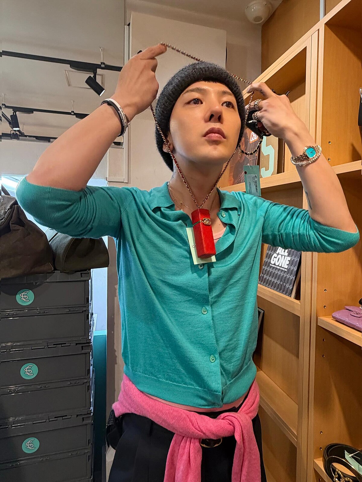 對於時尚很有獨到見解的GD,常會配戴訂製珠寶、腕錶登場,《Übermensch》巡演期間,GD委託洛杉磯訂製珠寶品牌MCI Jewelry訂製專屬巡演項鍊,更作為韓國站的演唱會周邊,讓粉絲真的能夠跟愛豆擁有同款!而在去年底,大家也眼尖發現GD在MAMA年末舞台上多戴了一條七彩的MCI Jewelry訂製項鍊,同樣以巡演主題「Übermensch」為靈感,取古英文中的「U」字母作為主體設計,並鑲嵌逾5種顏色寶石。另外,GD身上還有一款價格較為親民的作品,同樣來自MCI Jewelry,以光環鑲嵌搭配近年熱門的網球項鍊設計。