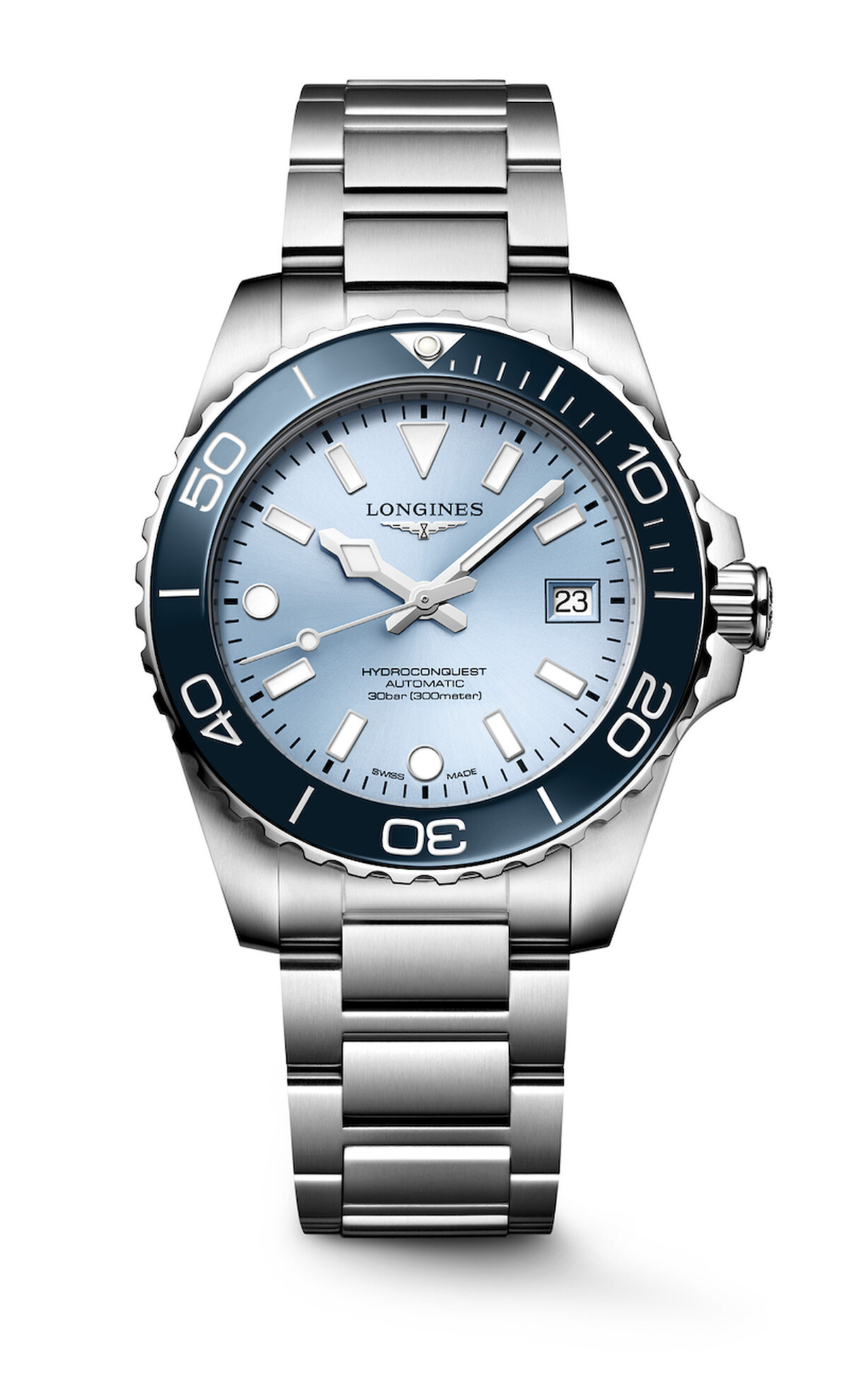 Longines Hydroconquest 深海征服者系列腕錶磨砂霜霧藍款,直徑42毫米精鋼及陶瓷錶殼,機芯設有單晶矽擺輪游絲,儲能約72小時,鏡面雙面多層防反光塗層,防水300公尺,配備微調系統雙重安全摺疊錶扣。
