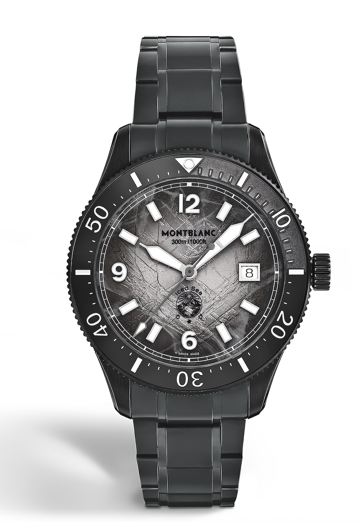 Montblanc Iced Sea 系列零氧腕錶,直徑41毫米仿舊精鋼錶殼,黑色陶瓷單向旋轉錶圈 0-15 分鐘部分經鐳射雕刻,日期顯示,防水300公尺。