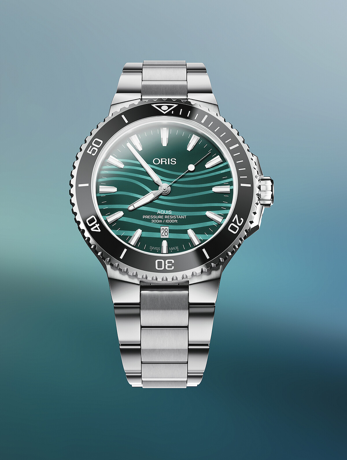 Oris Aquis江豚限量腕錶,43.5毫米精鋼錶殼和單向旋轉鎢合金上圈 ,藍寶石水晶玻璃錶鏡,內層抗折射塗層,旋入式不銹鋼底蓋,飾以圖騰鐫刻,防水300公尺,動力儲存 41小時,錶盤設計帶回聲波圖案的藍綠色珍珠母貝,螢光塗層Super-LumiNova® 指標,金屬錶帶搭配折疊扣