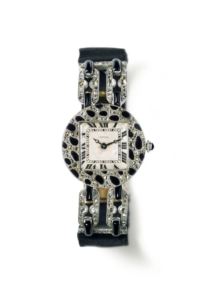 同年1914年,黑白相間的豹紋圖樣成為Cartier的裝飾元素之一,出現在兩只女用腕錶上。縞瑪瑙與鑽石交織出斑點圖案,是較為抽象的美洲豹圖騰,這也是品牌歷史文件當中有正式紀載的首款美洲豹設計作品,相當具有指標性。