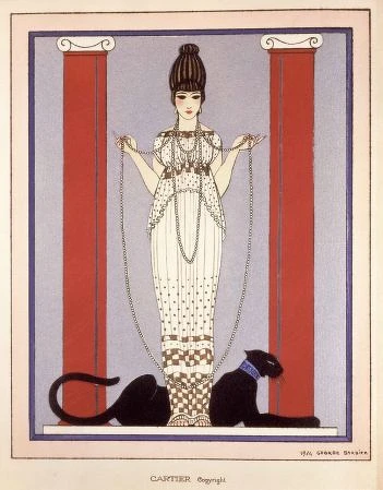 1914年,路易卡地亞(Louis Cartier, 1875-1942)向插畫家喬治巴比耶(George Barbier)訂製了一幅「美洲豹之女」(Lady of the Panther),用作品牌展覽邀請卡。這幅優雅的繪圖採用了Art Deco裝飾藝術晚期的風格,一位年輕女子身著保羅波瑞(Paul Poiret)設計的褶襉長袍,美洲豹則躺在她的腳邊作為背景的一部分。