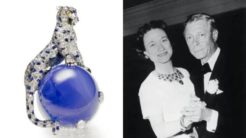絕對是1949年品牌為溫莎公爵夫婦製作的胸針!鉑金、白金,身體舖鑲鑽石及藍寶石,眼睛為黃鑽,美洲豹站在一顆152.35克拉的明亮天鵝絨藍喀什米爾藍寶石上(這顆寶石是溫莎公爵夫人的私人收藏)。栩栩如生的美洲豹頭部可以左右轉動,在當時曾有一段軼聞:在宴會場合,如果溫莎公爵夫人想要離開時,只要將美洲豹的頭部往左轉,溫莎公爵即知道要帶他的夫人回家了。